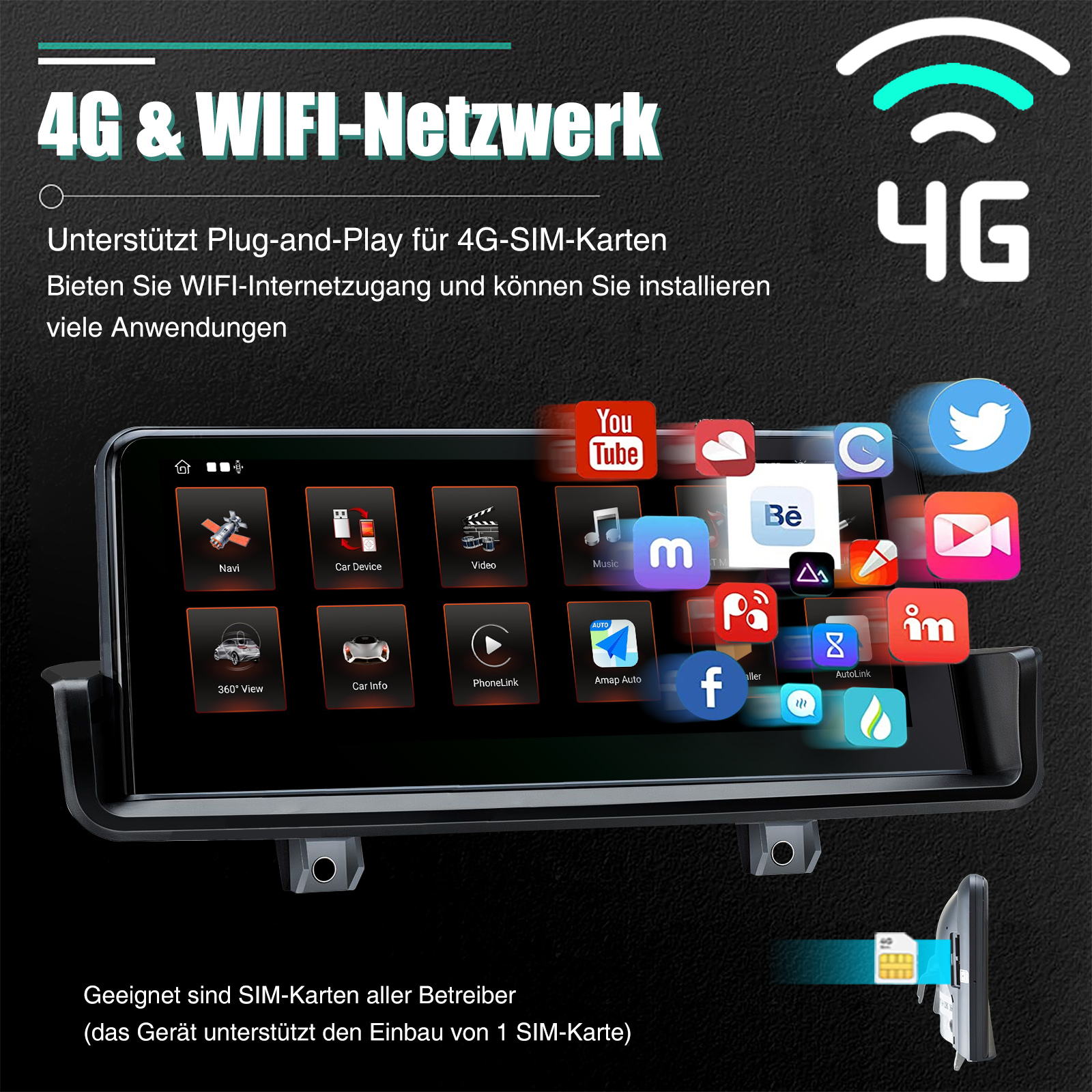- Built-in 4G und WIFI-Modul für Internet, legen Sie einfach Ihre 4G-SIM-Karte, egal wo Sie fahren, werden Sie den Spaß von Internet-Surfen genießen, machen es möglich, für Online-Navigation / Musik / Film ect.