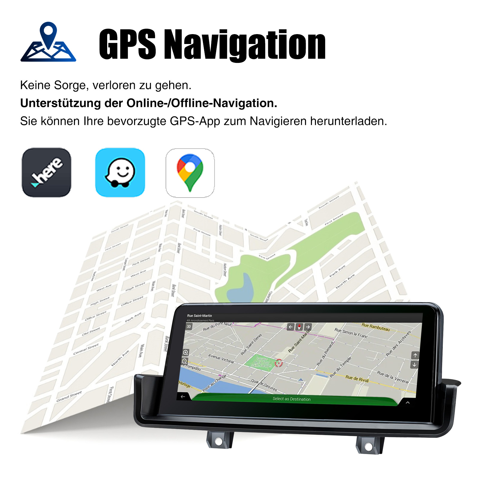 GPS Navigation 4G und WiFi: Sie können zwischen Offline- und Online-Navigation wählen! Mit vorinstallierten Offline-Karten können Sie nach dem Anschließen der GPS-Antenne in unserem Paket Koordinaten/Postleitzahlen/Adressen/POIs zur Routenplanung verwenden. Sie können Online-Navigations-Apps auch über WLAN und 4G-Netzwerke herunterladen. Außerdem können Sie andere Apps/Musik und Videos über WLAN und 4G-Netzwerke herunterladen!