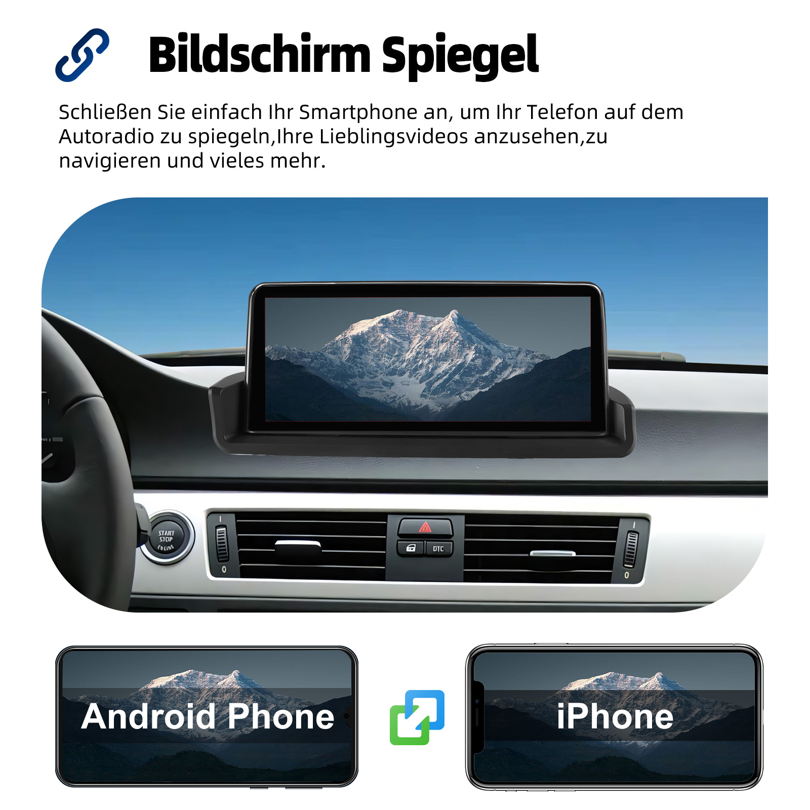 Mirror Link: Mit diesem Autoradio erleben Sie die beeindruckende Mirror-Link-Funktion, die mit iOS- und Android-Telefonen kompatibel ist. Sie können den Bildschirm Ihres Smartphones auf das Autoradio spiegeln und dabei Apps wie Google Maps, Spotify, Youtube usw. nutzen. Ersetzen Sie Ihr Mobiltelefon durch den Autobildschirm und verwandeln Sie Ihr Fahrzeug in eine intelligente Plattform.