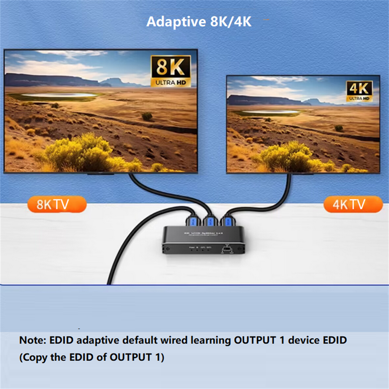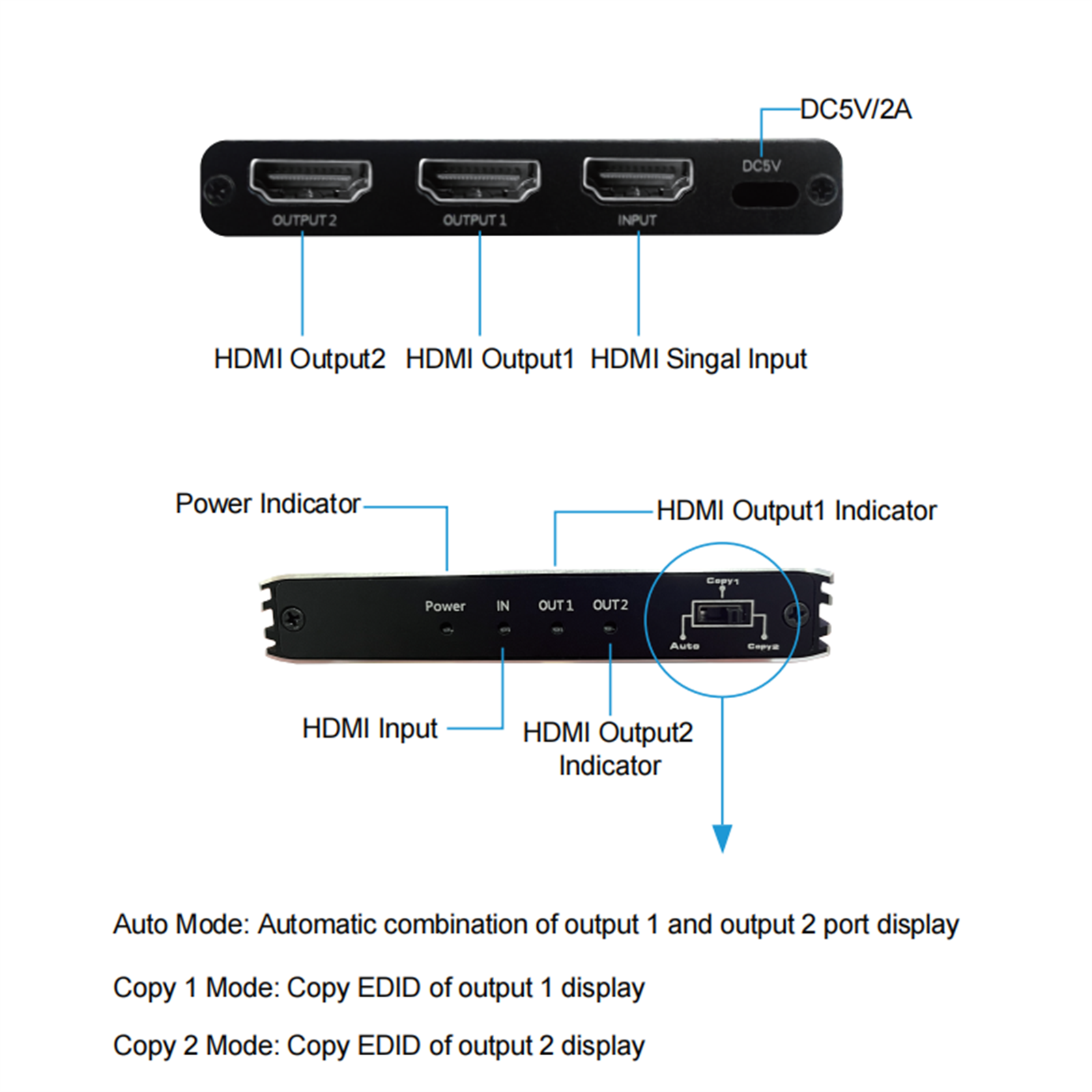 2. Smart EDID management: EDID HDMI Splitter provides 3 switching modes that can be met for different resolution needs.With flexible EDID switching you can set the desired output signal for your video sources to improve compatibility with your display or projector and works stability
