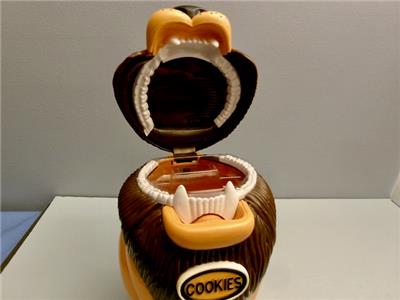 COOKIE JAR WAS NEVER USED HAS THE ORIGINAL INSERT IN THE MOUTH SAT ON A SHELF WITH OTHER JARS FOR YEARS