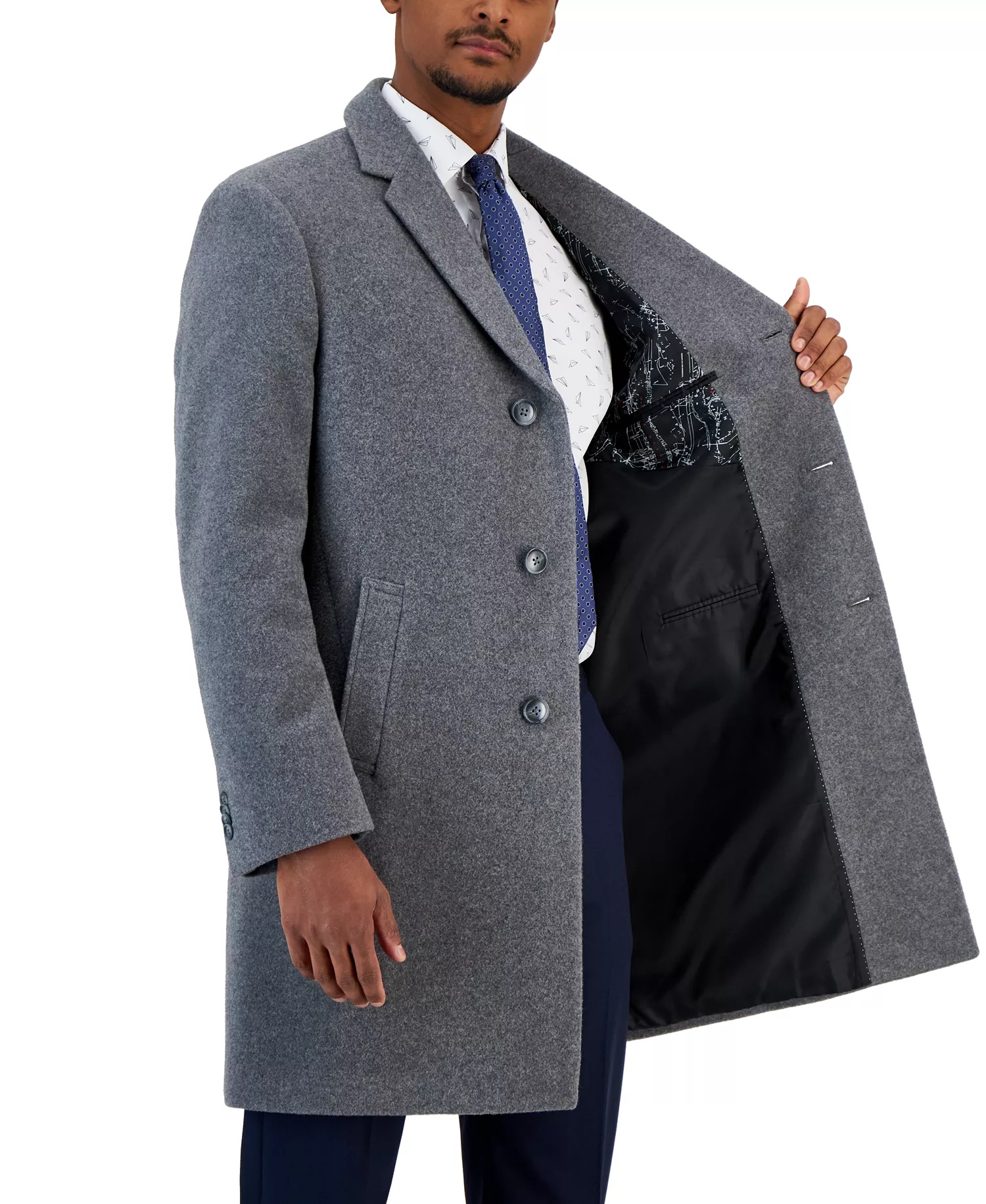 Imported Three-button closure Notch lapel Four button cuffs Two front slash pockets; three internal pockets Center vent Size & Fit Classic/regular fit Length approx. 38" Materials & Care Shell: wool/nylon/cashmere; lining: polyester Dry clean Fully lined; Upper inside lining has a printed nautical map