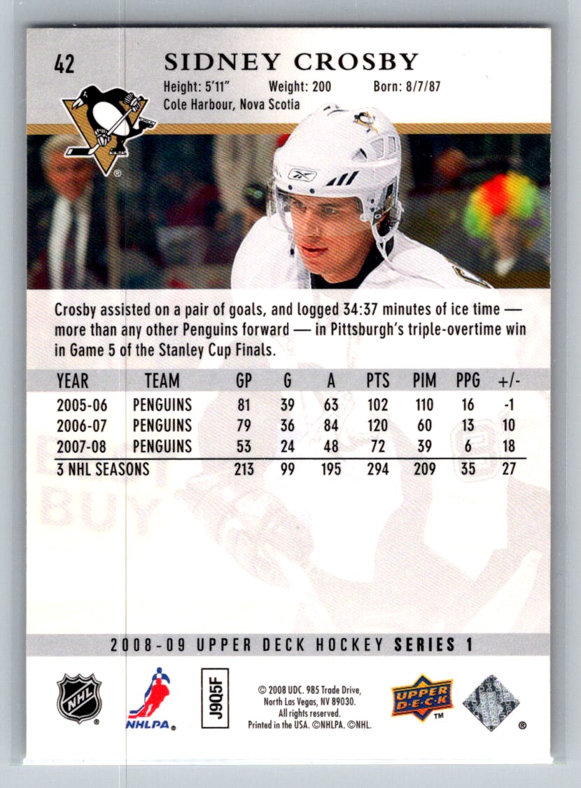 | 2008-09 Upper Deck Sidney Crosby Pittsburgh Penguins #42 |