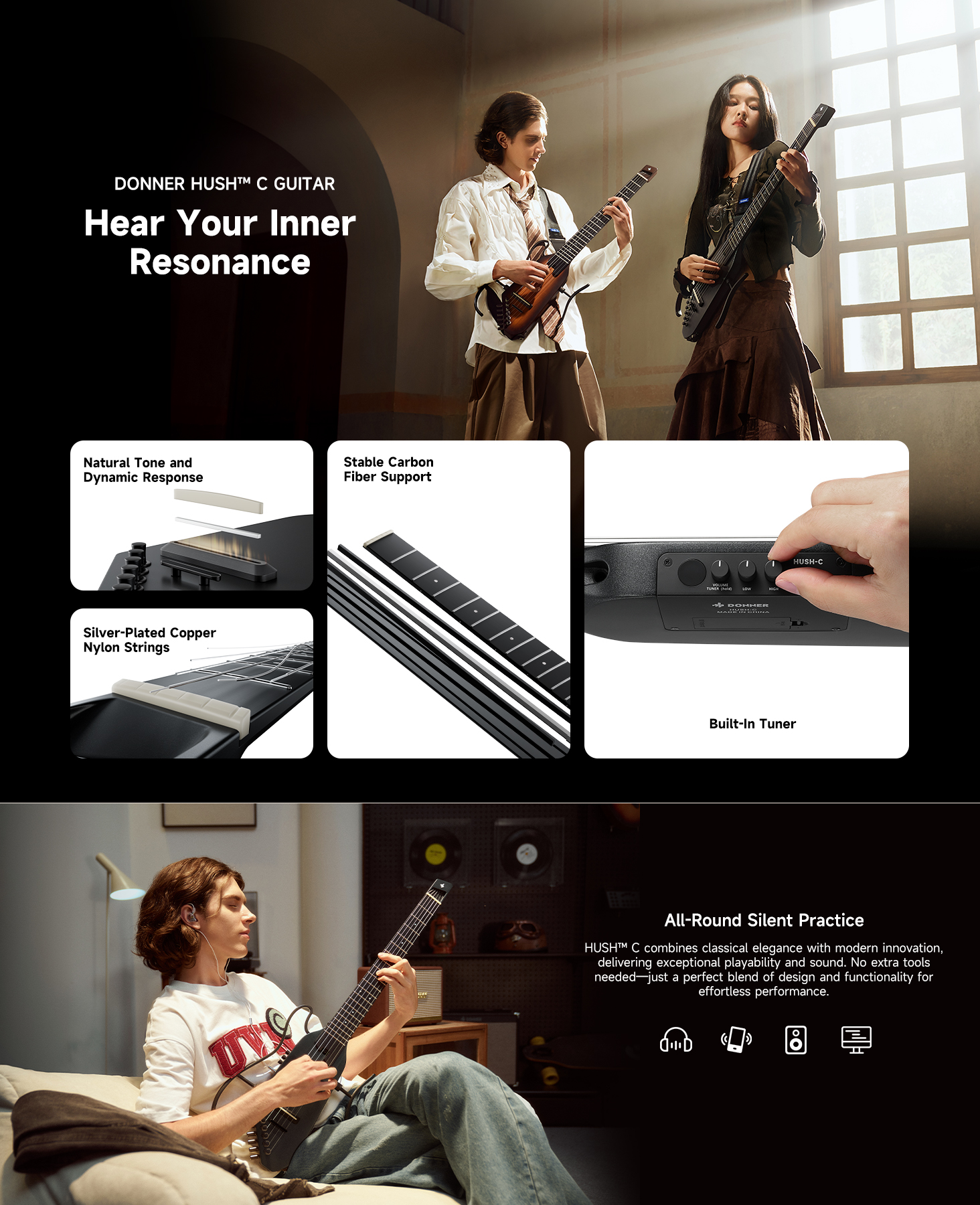 【 Comfort & Versatility for All Players 】With a 46mm nut width, thin C-shaped neck, and smooth satin finish, the HUSH-C Nylon Acoustic Electric Classical Guitar offers fast, fatigue-free play for both beginners and pros.