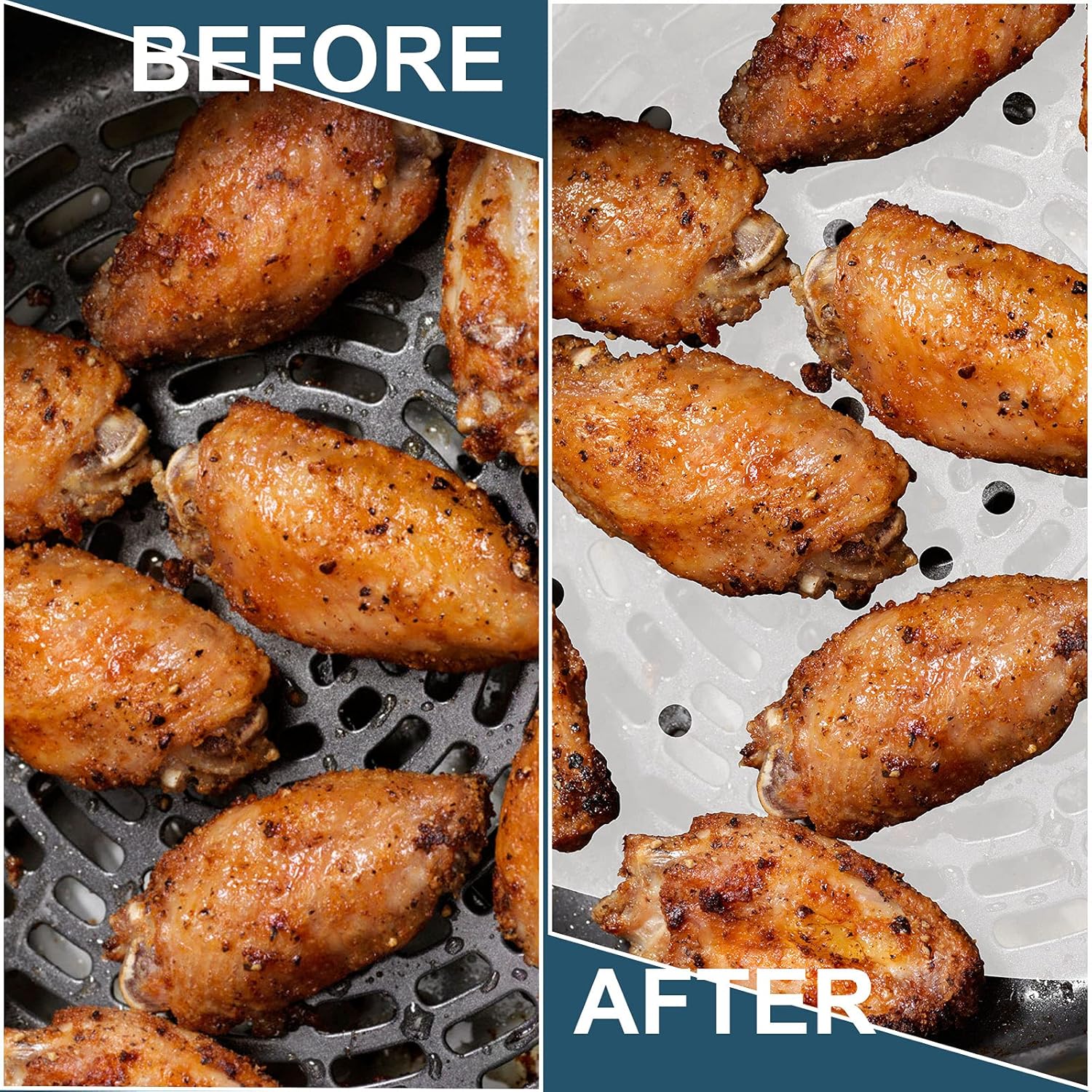 Non-Sti & Easy to CleanPerforated steing paper for air fryer,steing parchment liner,If you hate scraping food this is a must,Our air fryer parchment paper will protect your paper for air fryer,keep Bread,bacon,chien,beef,turkey,buns e taste,And keep your air fryer from food residue,make clean up a breeze.