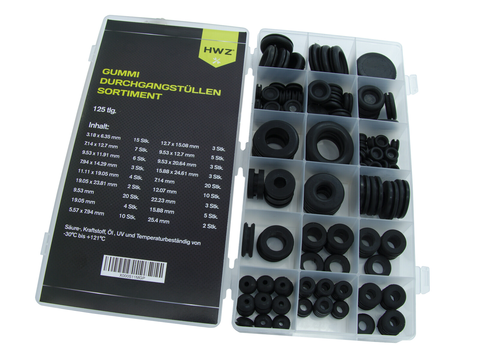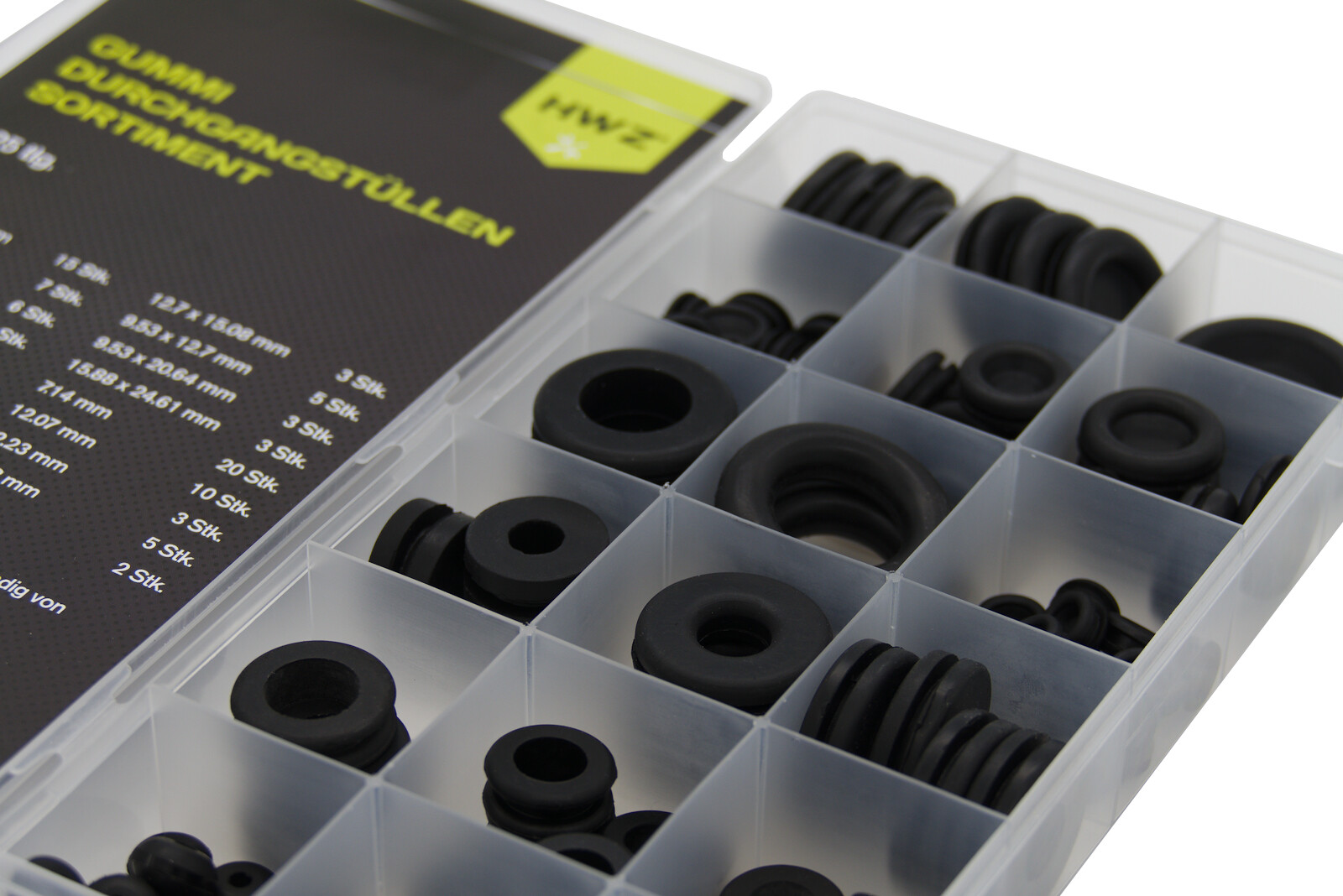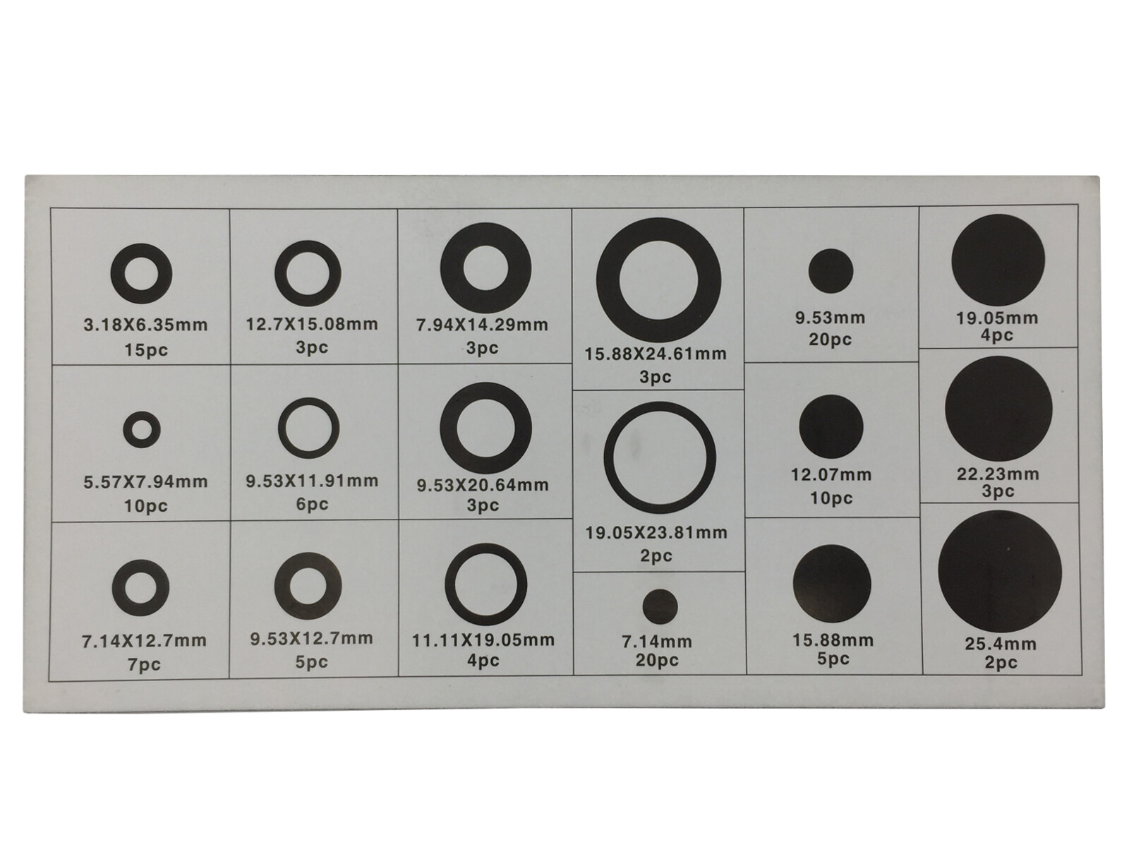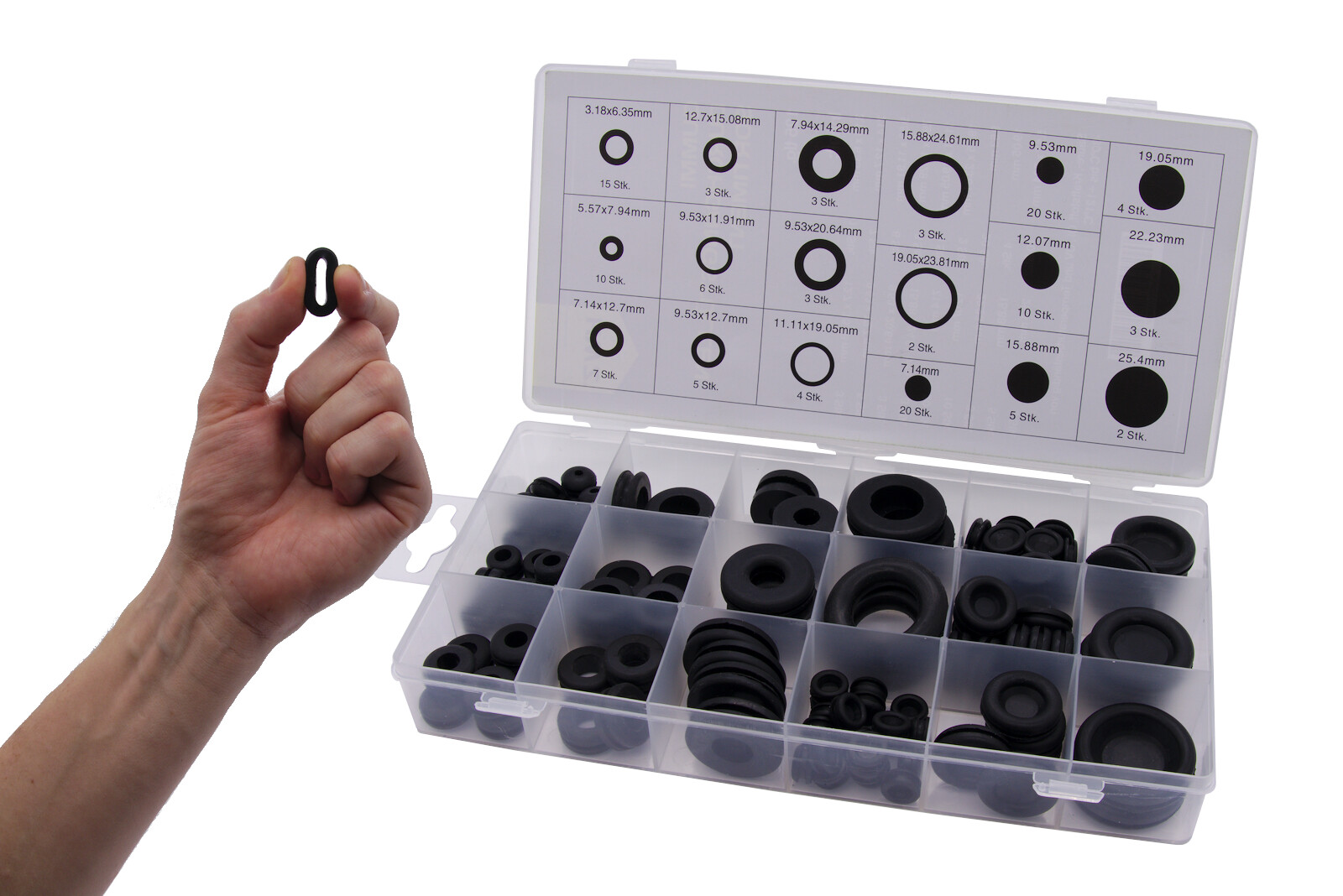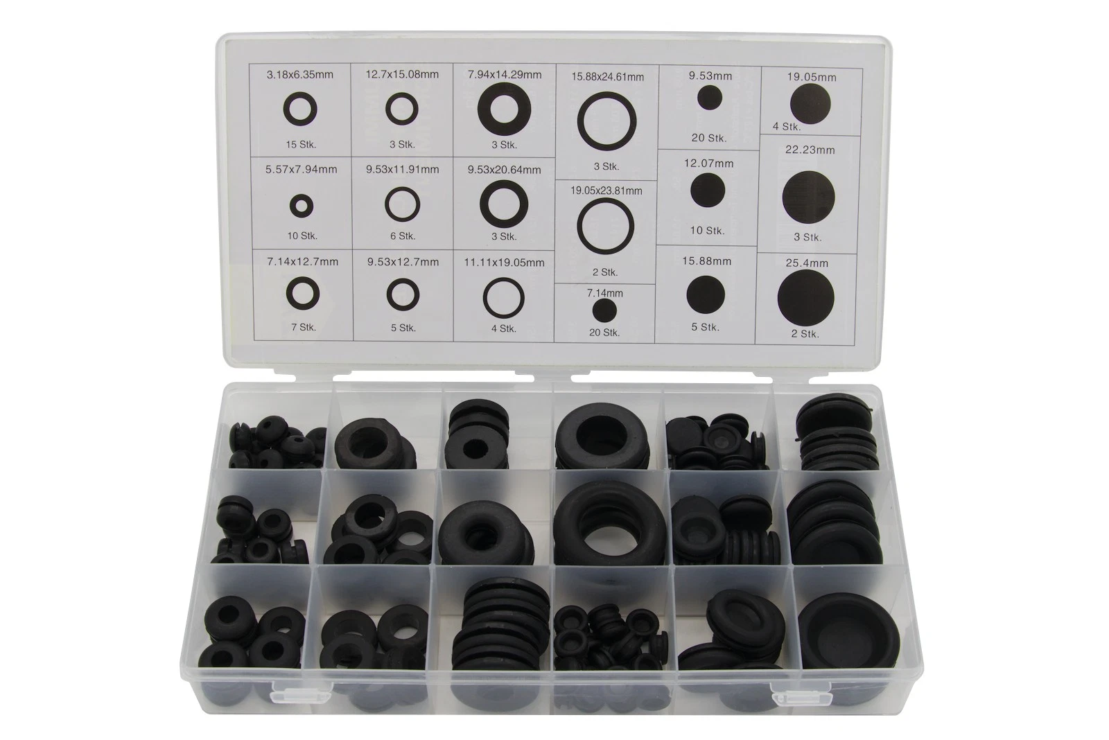 15 Stück 1/8" x 1/4" offen 10 Stück 7/32" x 5/16" offen 7 Stück 9/32" x 1/2" offen 3 Stück 5/16" x 9/16" offen 6 Stück 3/8" x 15/32" offen 5 Stück 3/8" x 1/2" offen 3 Stück 3/8" x 13/16" offen 4 Stück 7/16 x 3/4" offen 3 Stück 1/2" x 19/32" offen 3 Stück 5/8" x 31/32" offen 2 Stück 3/4" x 15/16" offen 20 Stück 9/32" geschlossen (7,14mm) 20 Stück 3/8" geschlossen (9,5 mm) 10 Stück 1/2" geschlossen (12,5 mm) 5 Stück 5/8" geschlossen (15,9 mm) 4 Stück 3/4" geschlossen (19,05mm) 3 Stück 7/8" geschlossen (22,2 mm) 2 Stück 1" geschlossen (25,4 mm)