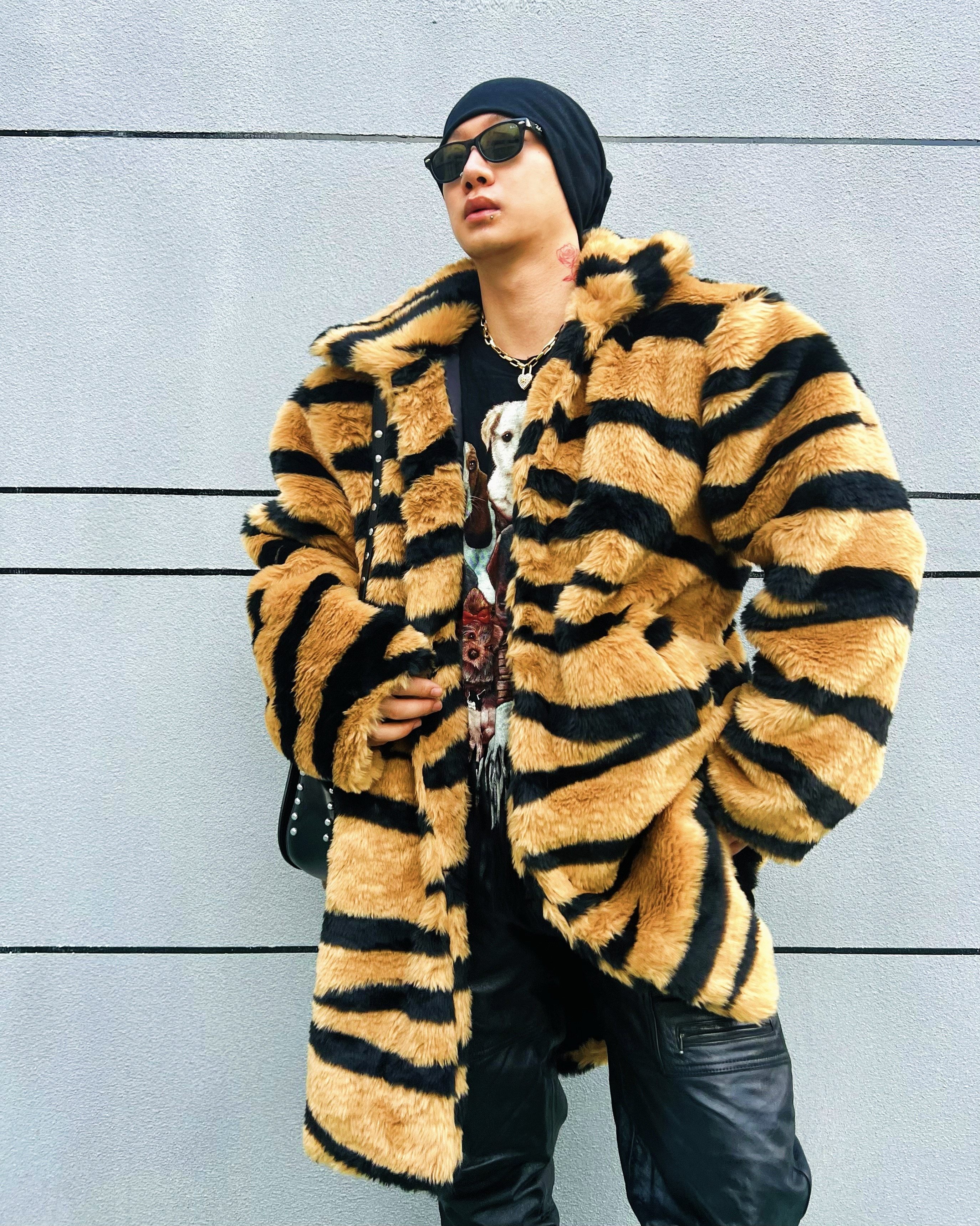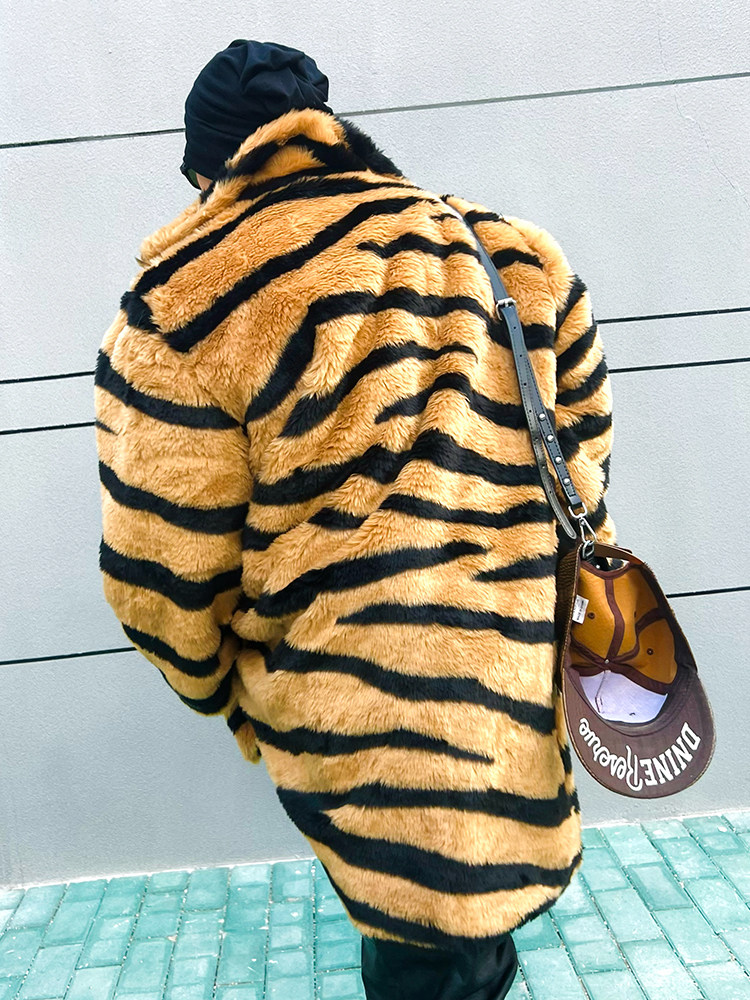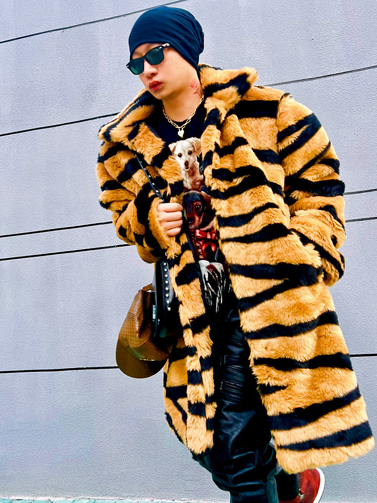 Mens Fur Coat Loose Trendy Hip-hop Lapel Mid-length Print Coat Fur Jacket Warm