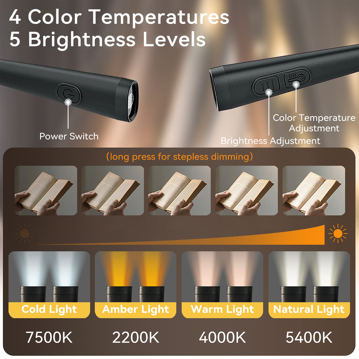 💡 Stepless Dimming 💡: Our book light features 4 color temperature modes: Yellow, Warm White, Nature White and Cool White. Each light head has an independent switch, and the Each color can be individually dimmed steplessly. In other words, it's the same.