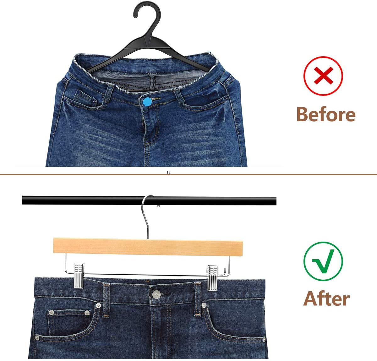 Adjustable Non-Slip Clips: The adjustable clips with rubber cush of the wooden skirt hanrs can slide easily from left to right,meeting your different size needs. Also,made by high-grade steel,the pinches are strong enough to hold your heaviest garments. bottom hanrs for your skirts,pants,trousers,slas and jeans