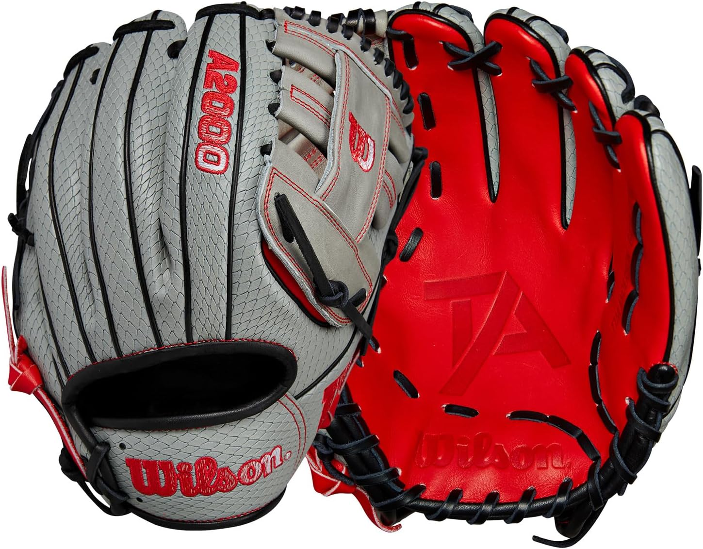 New Wilson A2000 Game Model Baseball Glove RHT 11.5" Pro Stock Leather Gray/Red Wilson 2024 Tim Anderson A2000 TA7 GM 11.5” Infield Baseball Glove - Right Hand Throw Pro Stock Leather: Pro Stock Leather is preferred for its rugged durability and unmatched feel; SuperSnakeSkin: SuperSnakeSkin is a microfiber material that’s half the weight of Pro Stock Leather, but twice as durable - in an all-new textured design. Its moisture-resistance extends the longevity of the glove, and is easier to clean than traditional leather. Comfort Pro Fit: Featuring our ProLux Leather, the liner of the redesigned A2000 has a richer, softer feel against your hand. The all-new Comfort Sleeve is the finishing touch, concealing the binding in the wrist for more comfort than ever before. Rolled Dual Welting: Dual Welting in Wilson gloves goes beyond a mere cosmetic effect, as it’s integrated into the liner of each infield, outfield and pitcher's model, offering better support and helping your glove hold its shape better over time.; DriLex Wrist Lining: Keeps your hand dry and comfortable on the field and behind the dish Flat Finger Binding: Flat Finger Binding gives players who prefer to play with a finger outside the glove greater comfort and control in the field. By reducing the amount of space between your finger and the back of the glove, you’ll experience less pain when making plays; Bold Logos: Bold logos strip away the distractions, allowing outlined, eye-catching Wilson logos to announce a new era in the iconic story of Wilson Ball Gloves.
