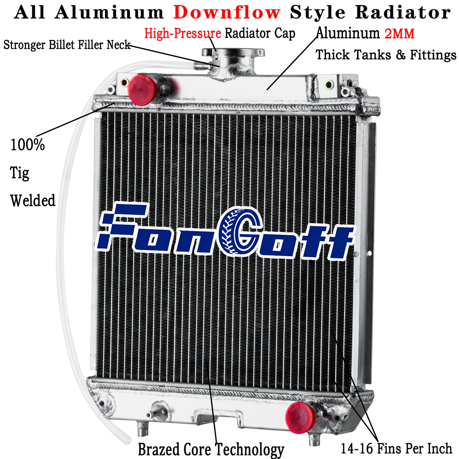 This Aluminum Radiator is designed to provide maximum cooling efficiency to prevent premature engine failure. Its light-weight, and high-heat transferring aluminum features a tube and fin design that, dramatically increases surface area that enables the heat to dissipate more efficiently. This Aluminum Radiator is at least 30%-45% more efficient than stock ones. Most importantly, it has a much higher capacity for coolant than stock ones, which means that your cooling system will be more efficient and will be more resistant to temperature surges in racing applications.