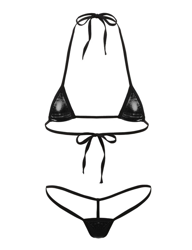 Glossy minimal coverage, halter neck with spaghetti straps tie at back, can be adjusted to fit your size.