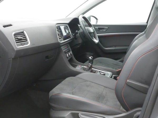 Cruise control system with speed limiter, SEAT drive profile with driving experience button - Normal, Sport, Eco and Individual mode, steering and throttle response, Self parking functionality (includes front and rear parking sensors), Wireless full link smartphone integration, Wireless phone charger, Steering wheel mounted audio/phone controls, Daytime running lights, Full LED headlamps with lens and LED front fog lamps with cornering function, LED rear tail lights with dynamic indicators, Dual zone climate control, Height adjustable driver and passenger seat with lumbar adjustment, ISOFIX points in outer rear seats with top tether anchorage points, Leather steering wheel and gear knob, Microsuede upholstery with front sports seats, Convenience pack - Ateca, Interior lighting pack - Ateca, Navigation system pack with DAB - Ateca, Electric parking brake with auto hold function, Front assist with autonomous emergency braking, Hill hold control, Tiredness recognition system
