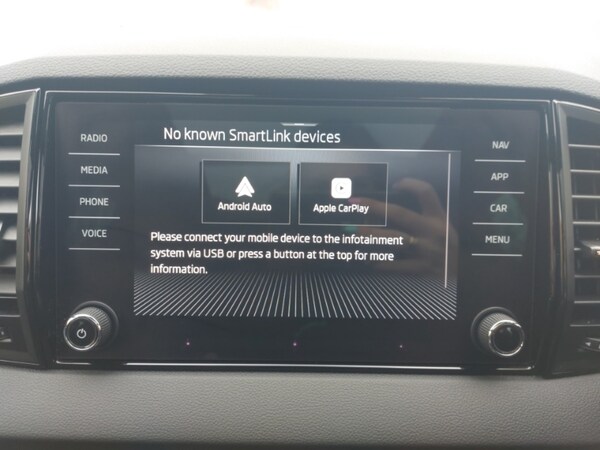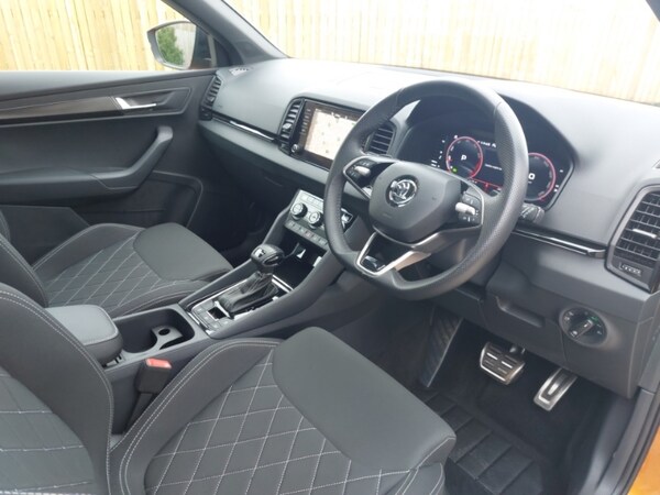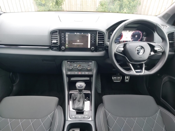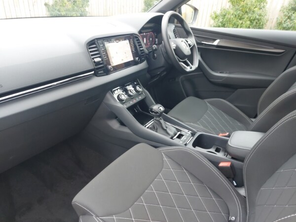 19"" Sagittarius anthracite alloy wheels, SmartLink wireless for Apple and wired for Android, LED Interior lighting pack with Skoda welcome logo - Karoq, Wireless smartphone charging, Light Pack - Karoq, DAB radio with Bluetooth, USB connection, Black door mirrors, Auto dimming rear view mirror with light and rain sensors, 12v socket in front centre armrest with storage compartment and rear air vents, 12V socket in boot, Non Smokers pack, Driver airbag, Automatic fuel cut off in case of crash, Electronic engine immobiliser, Alarm with interior monitoring, back up horn and tilt sensor with safe function, Satin black dashboard, carbon door decor, Breakdown and tool kit, Anti-theft wheel bolts protection