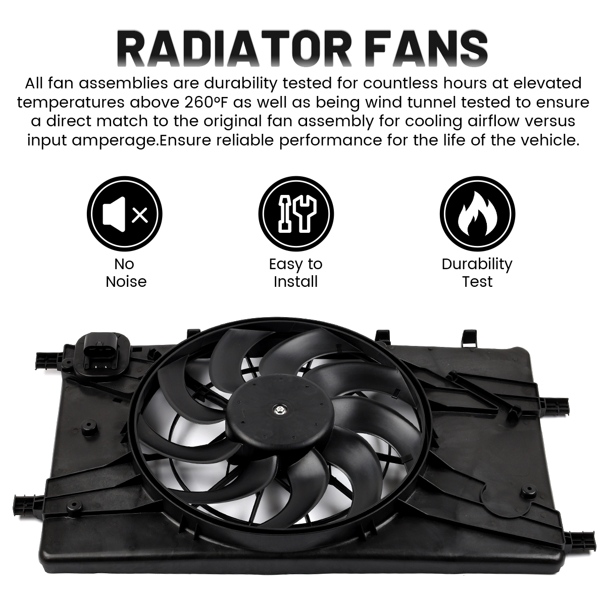 4.All fan assemblies are durability tested for countless hours at elevated temperatures above 260°F as well as being wind tunnel tested to ensure a direct match to the original fan assembly for cooling airflow versus input amperage.Ensure reliable performance for the life of the vehicle.