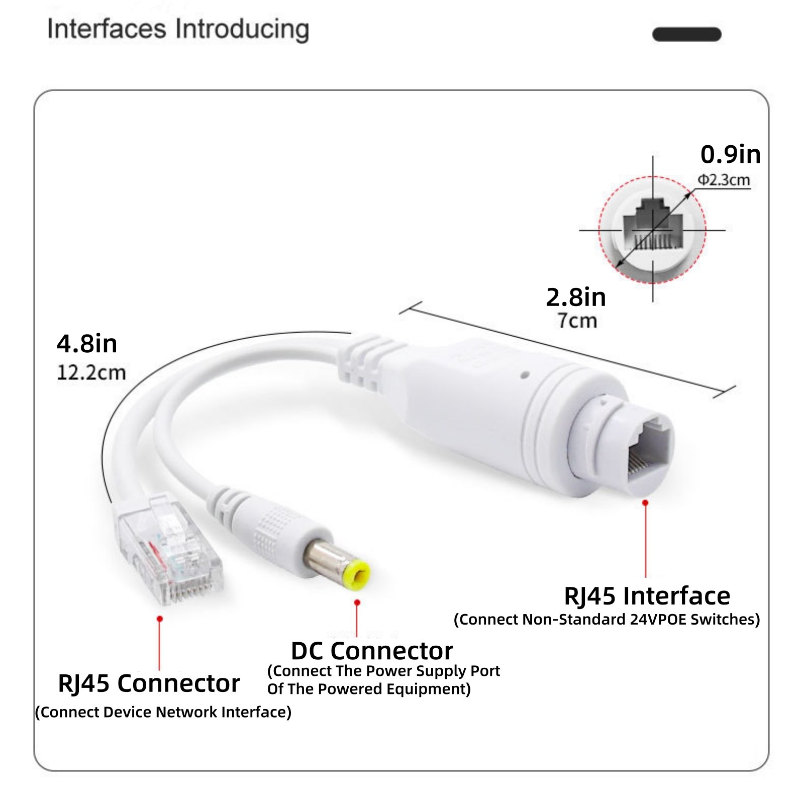 Features: 1. 100mbps POE Splitter: One Rj45 Ethernet Input Interface, One DC Power Output Interface And One Rj45 Output Interface 2. Compatible With Both 10/100Mbps Transmission Rates And Fast Installation Speed, Meeting The Needs Of Engineering Big Data Transmission Environments Such As Video Surveillance And Wireless Networks 3. Simple And Fast Wiring, Stable And Reliable Power Supply Plug And Play, No Configuration Required Powered Via The POE Input, Plug And Play. Automatically Detects And Protects POE Equipments From Being Damaged By Incorrect Installation. 4. Compatible With Various Brands Of Network Cameras On The Market, Built-In Voltage Reduction Module, Can Convert DC15-24V Non-Standard POE Switch Voltage Into DC12V Output, Output DC12V1.2A Can Provide Power For Small Ball Machines, Wireless APs, Access Control Systems And Other Devices, POE Input Supports 45/78 Power Supply Specifications: Name: 100mbps POE Splitter Condition: Brand New Transmission Rate: 100mbps Material: PVC Color: Shown As Picture Input Voltage: DC15-24V Output Voltage: DC12V 1.2A POE Power: 15W Power Supply Pins: 4/5 (+), 7/8 (-) Working Temperature: -10°C~70°C Package List: 1* 100mbps POE Splitter 1* Waterproof Cover Kit