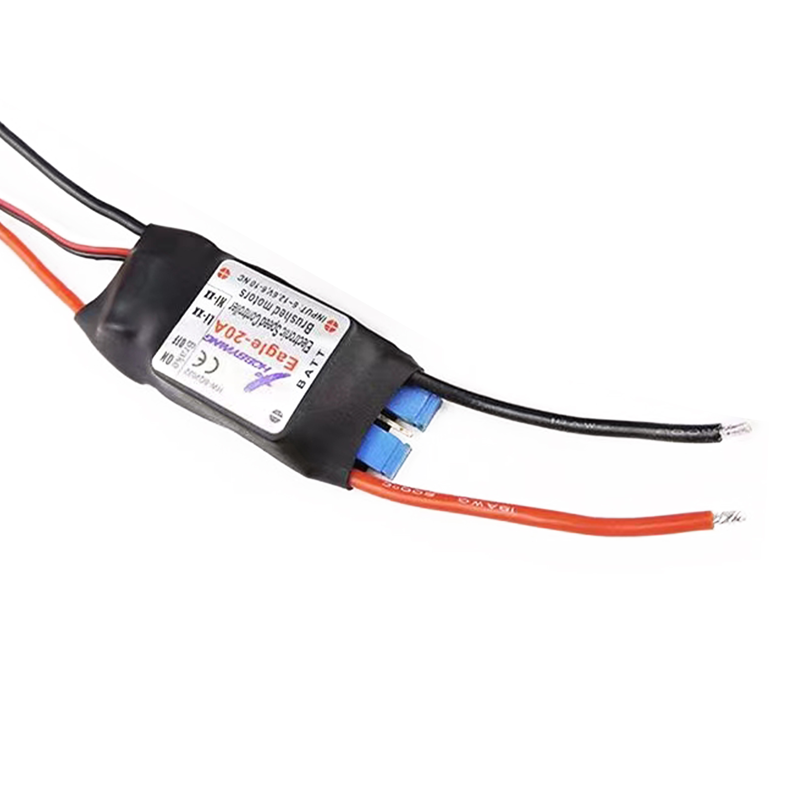 Specifications: Output: Continuous 20A, Burst 25A up to 10 Secs. Input Voltage: 2-3 cells lithium battery or 4-10 cells NiCd/NIMh battery. BEC: 1A / 5V (Linear mode) PWM Frequency: 2kHz. Size: 45mm (L) x 21mm (W) x 8mm (H)