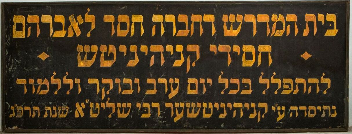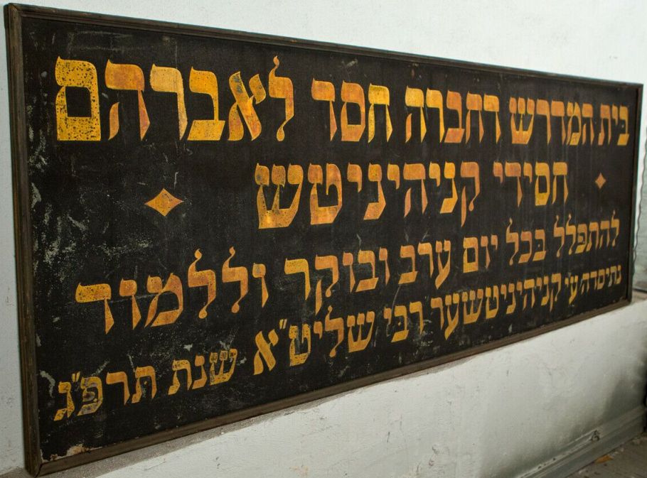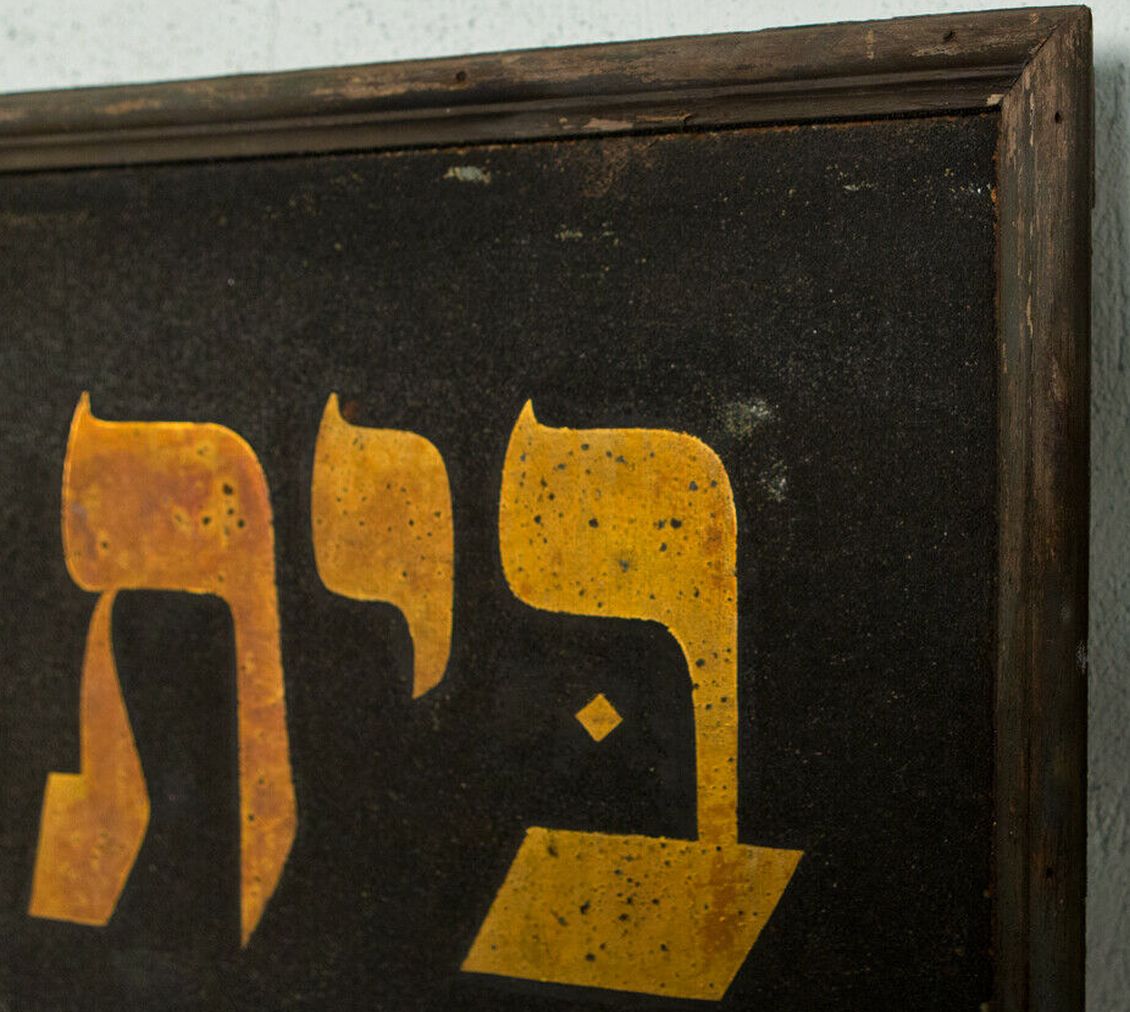 This is an enormous sign. It measures 8 feet wide, 3.5 feet high. It is metal that has been painted gold for the lettering and the background has applied black smalt, comes in the original wooden frame. It is dated 1923 in Hebrew, and the last photo is what I found regarding the details of the exact Synagogue that it came from.