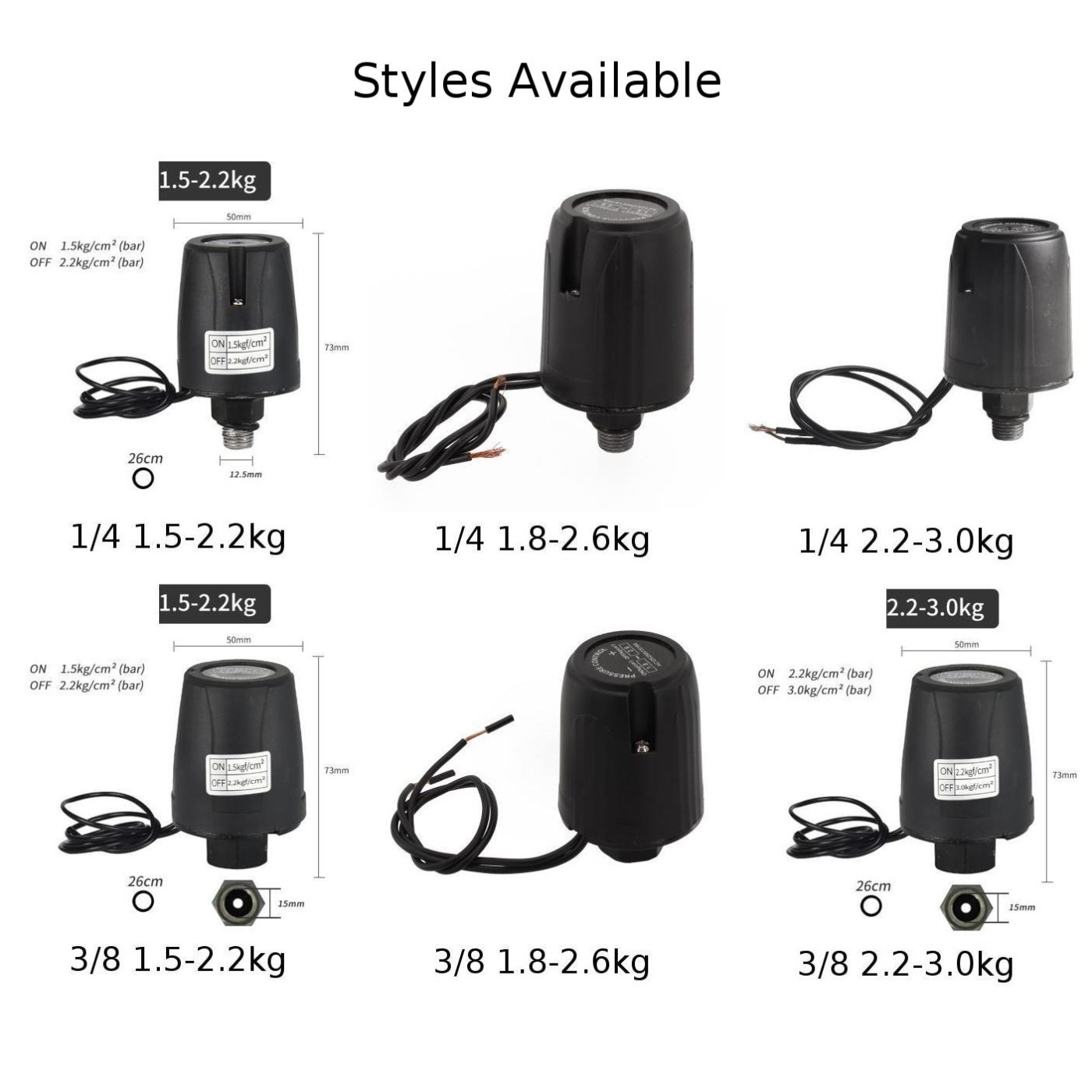 Pressure range: 3/8 1.5-2.2kg, 3/8 1.8-2.6kg, 3/8 2.2-3.0kg, 1/4 1.5-2.2kg, 1/4 1.8-2.6kg, 1/4 2.2-3.0kg (optional)