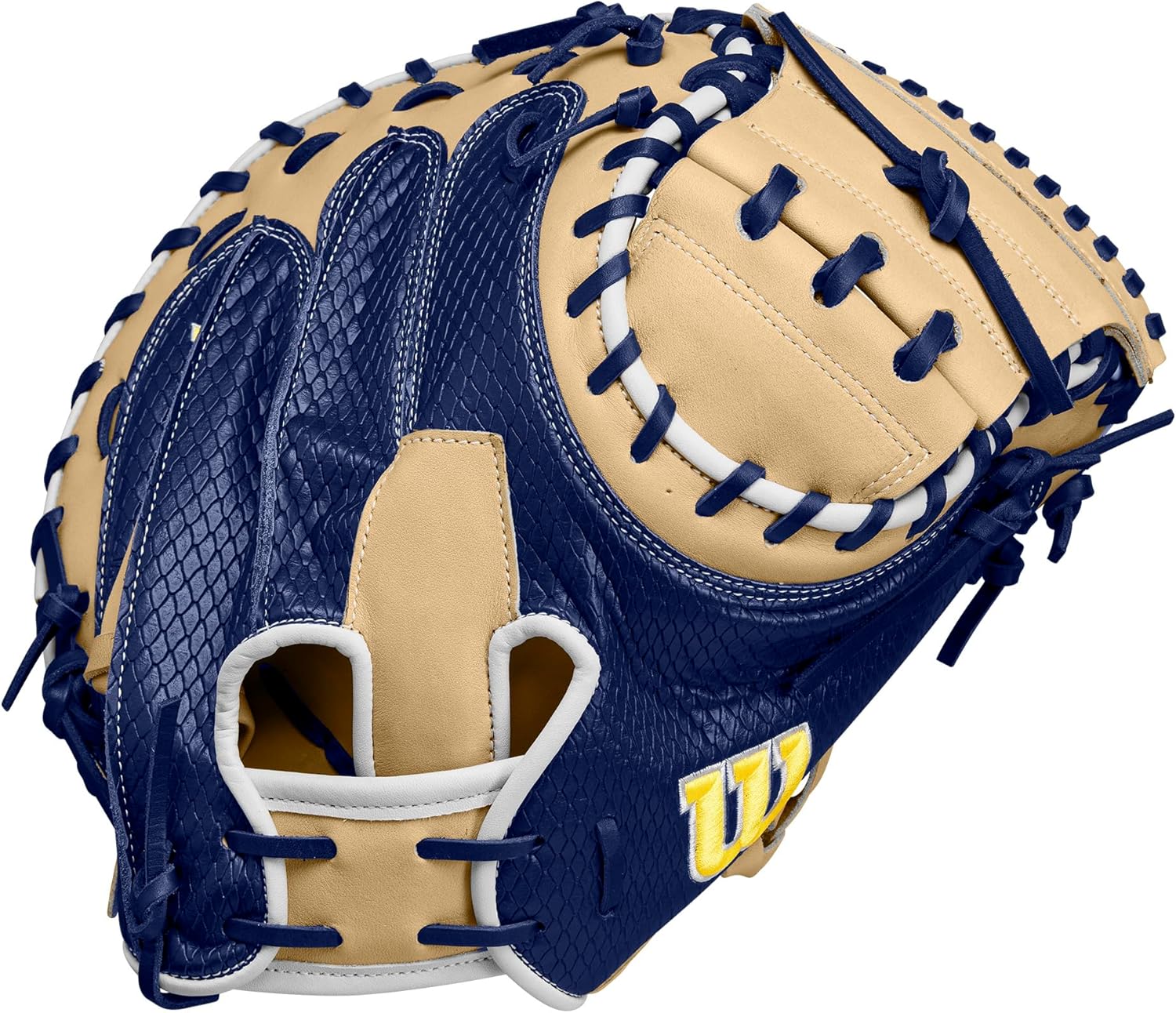 New Wilson Winter 2024 A2000 Catcher's Mitt 34" RHT Navy/Blonde Wilson Winter 2024 A2000 SA34SS 34” Baseball Catcher’s Mitt - Navy/Blonde, Right Hand Throw Pro Stock Leather: Pro Stock Leather is preferred for its rugged durability and unmatched feel SuperSnakeSkin: A microfiber material that’s half the weight of Pro Stock Leather, but twice as durable - in an all-new textured design. Its moisture-resistance extends the longevity of the glove, and is easier to clean than traditional leather. Flat Finger Binding: Gives players who prefer to play with a finger outside the glove greater comfort and control in the field. By reducing the amount of space between your finger and the back of the glove, you’ll experience less pain when making plays DriLex Wrist Lining: Keeps your hand dry and comfortable on the field and behind the dish Bold Logos: Bold logos strip away the distractions, allowing outlined, eye-catching Wilson logos to announce a new era in the iconic story of Wilson Ball Gloves.