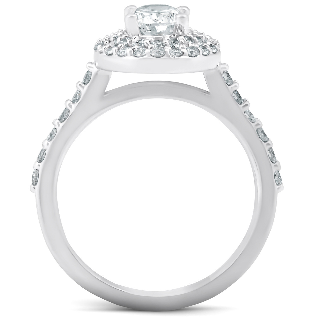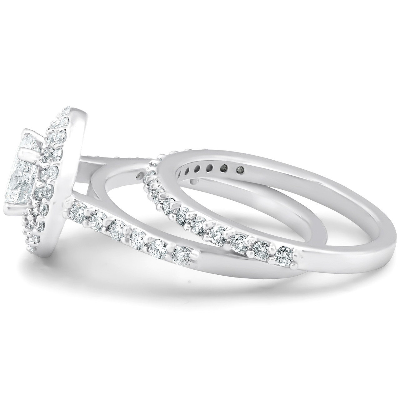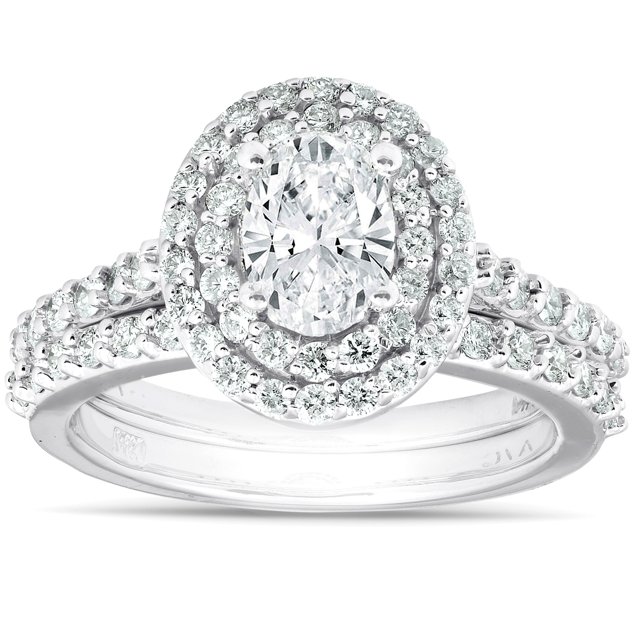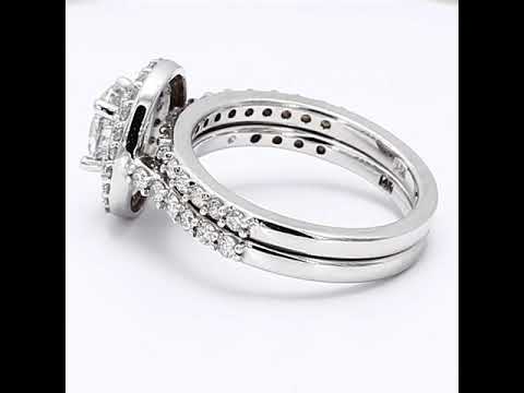 This high quality womens engagement ring set features a 1 carat oval lab grown diamond and 67 round cut lab grown diamonds. All diamonds are prong set in solid 14k white gold high polished mountings. Matching wedding ring is included.
