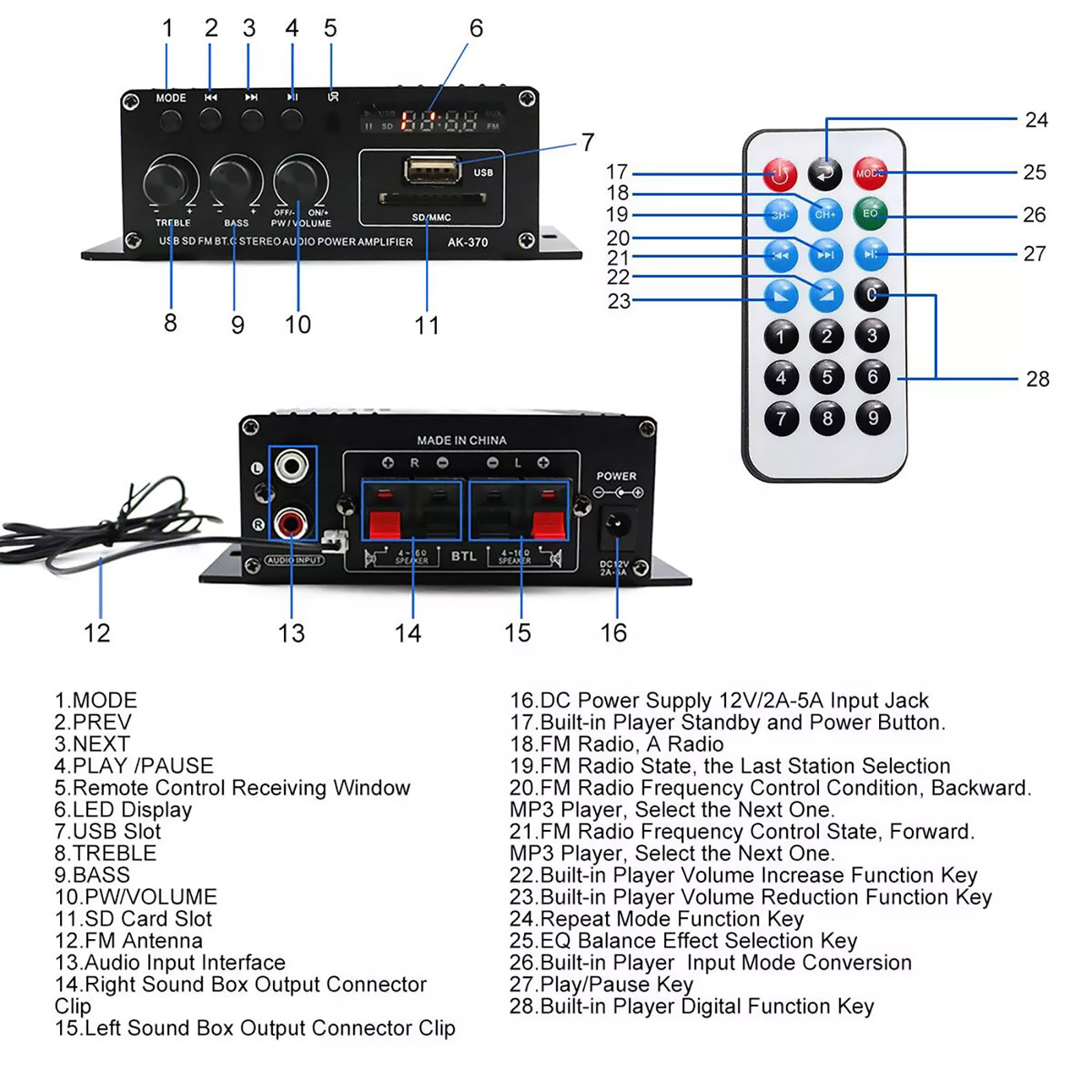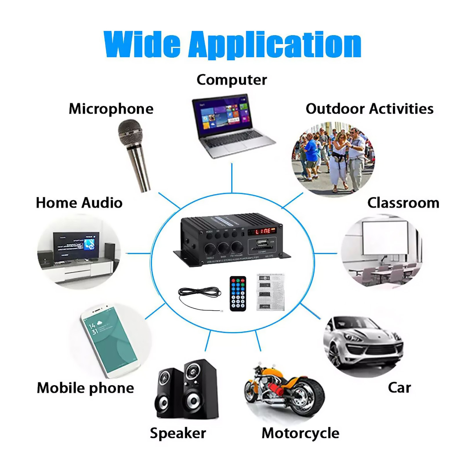 Suitable for SD Card, U disk, AUX input, MP3 format play, support bluetooth wireless connection.