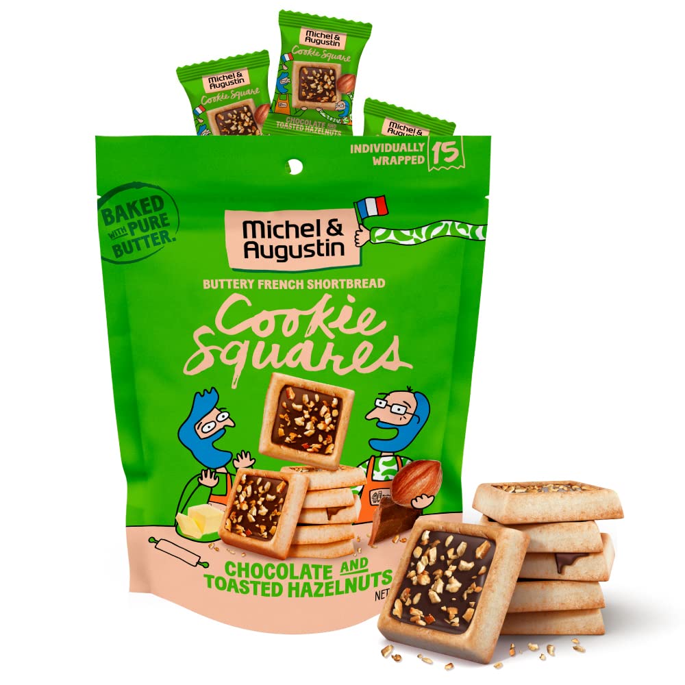 GOURMET SHORTBREAD COOKIES: 15 individually wrapped butter cookies filled with soft hazelnut chocolate ganache and sprinkled with real bits of toasted hazelnut.