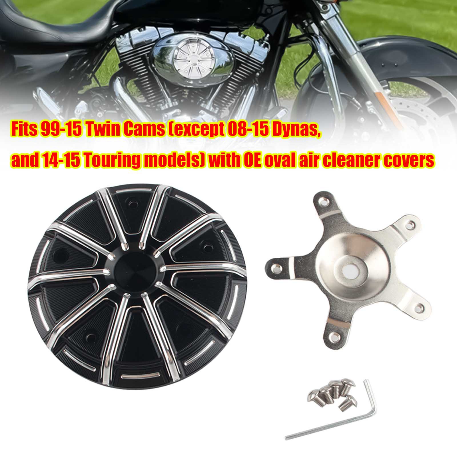 Fits 99-15 Twin Cams (except 08-15 Dynas, and 14-15 Touring models) with OE oval air cleaner covers