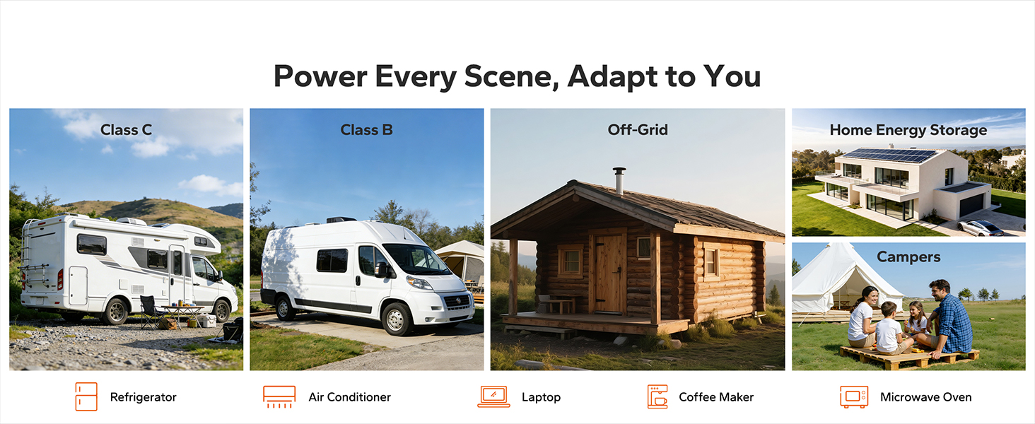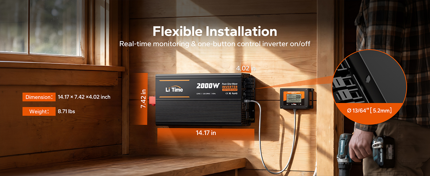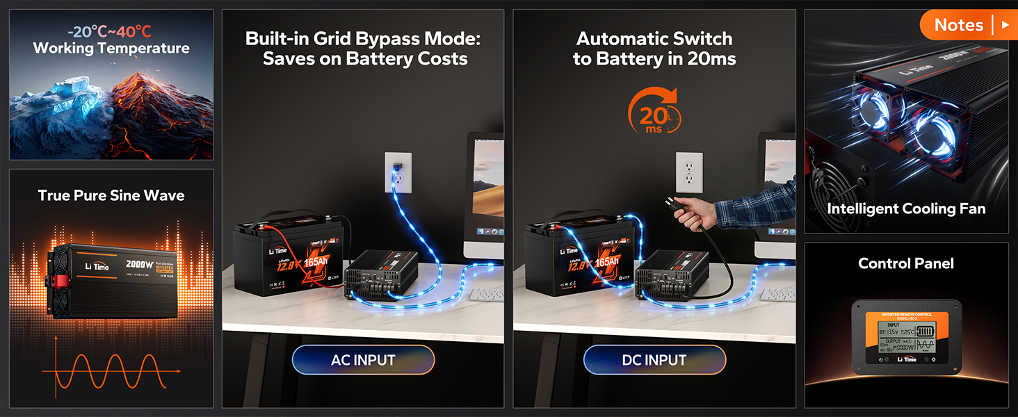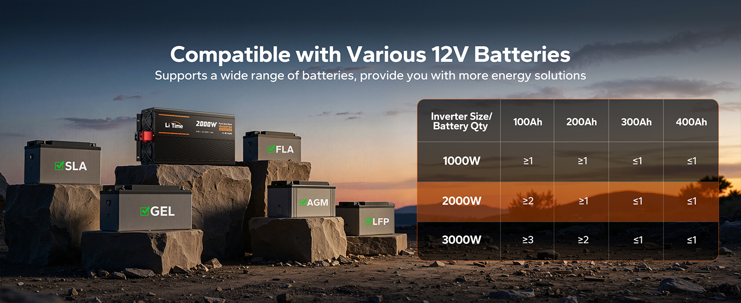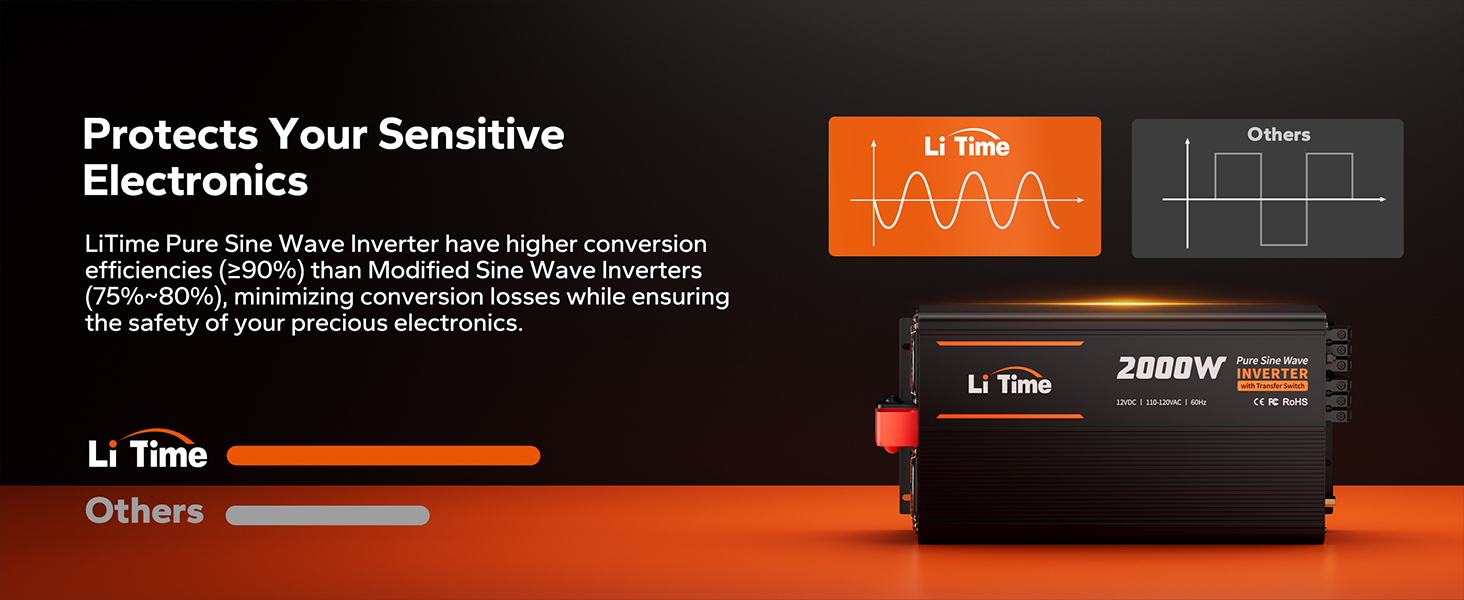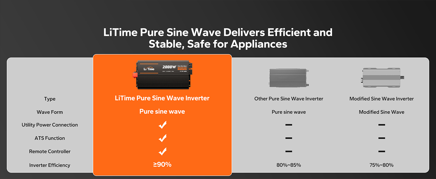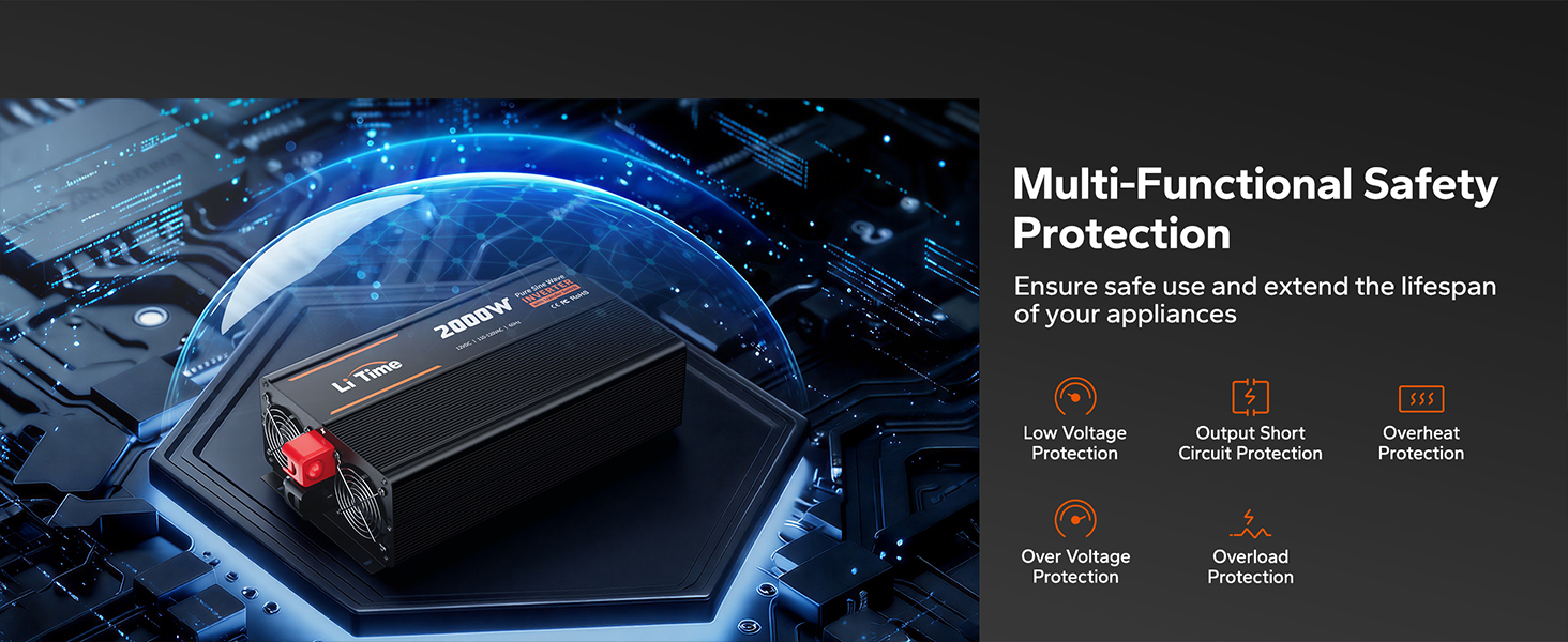 2000W Continuous / 4000W Peak Output Pure sine wave power for inductive loads and high-draw appliances. Whether you're on the road in an RV or out at sea on a yacht, just plug in and go.