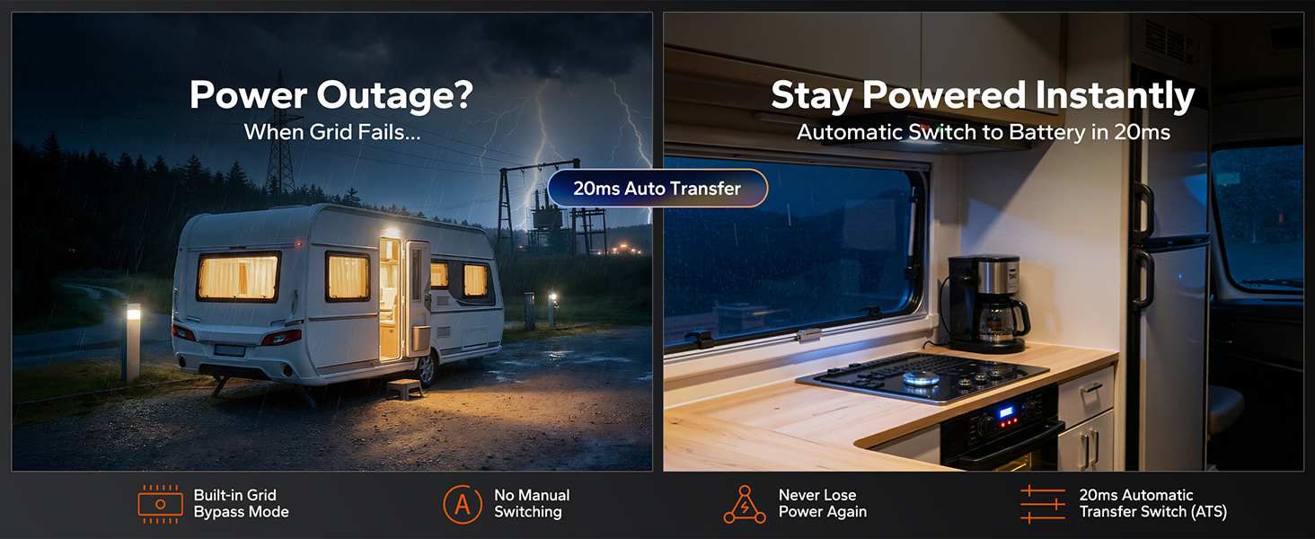 Built-in ATS, 20ms Seamless Switching Automatically switches between grid and battery power — your devices stay online with zero interruption and zero data loss.