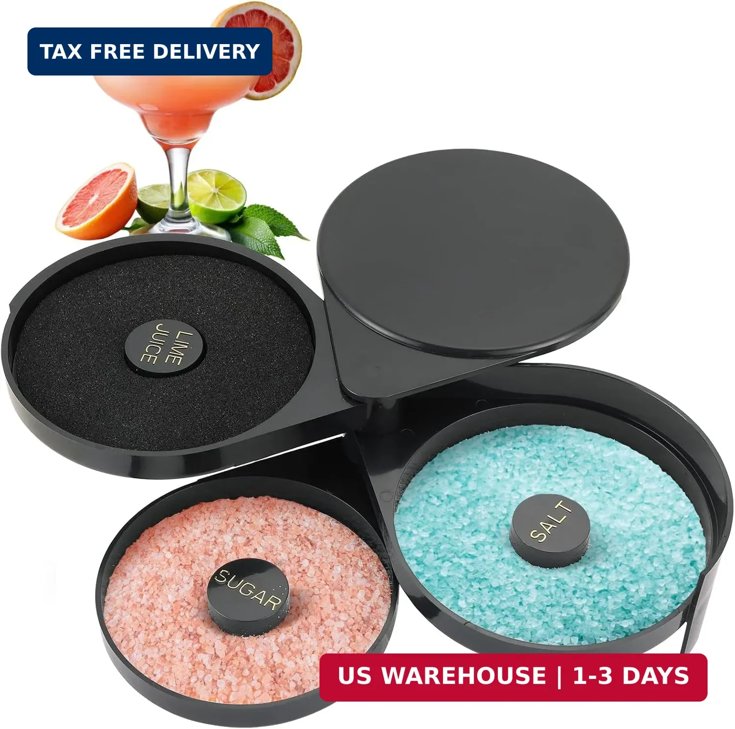 • Prefect for Cocktail Lovers: The 3-tier compartments allows for three separate slots to hold salt, sugar, and other spices at the same time. Black color is classic for any decor and uses in a bar / home bar. This 3-tier black bar glass rimmer with sponge is ideal for Margaritas, Bloody Marys and Gimlets etc.