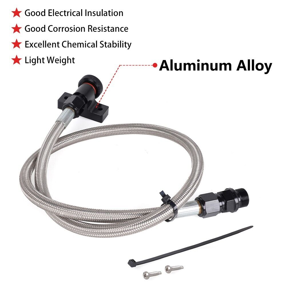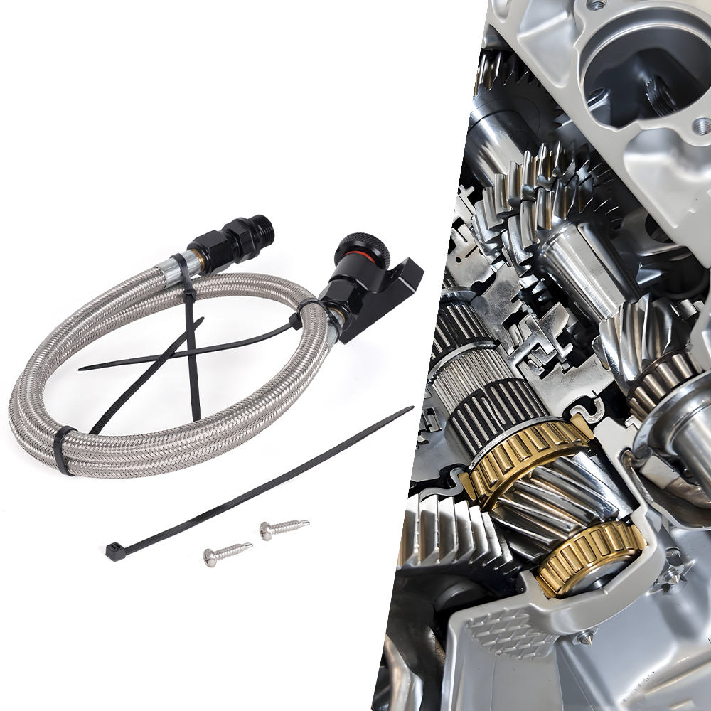 4) This transmission dipstick consists of billet stainless steel fittings, steel braided hose, and black anodized aluminum 6061-T6 cap and bracket. 5) Checks both cold and hot oil levels and can be mounted on the vehicle and locked into place