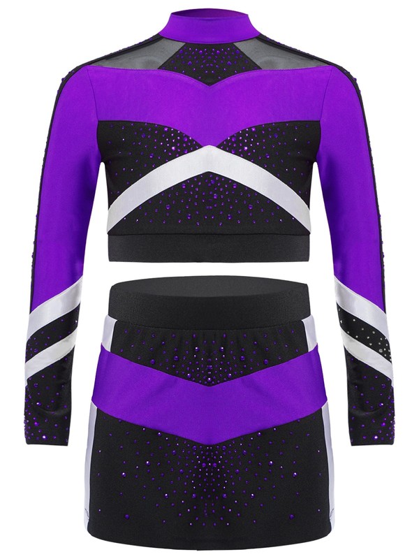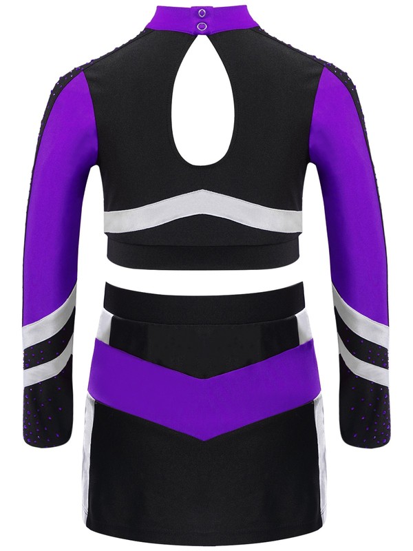 Girl’s cheerleading outfit with color block and shiny rhinestones is eye-catching enough to make your child the spotlight in any performance.
