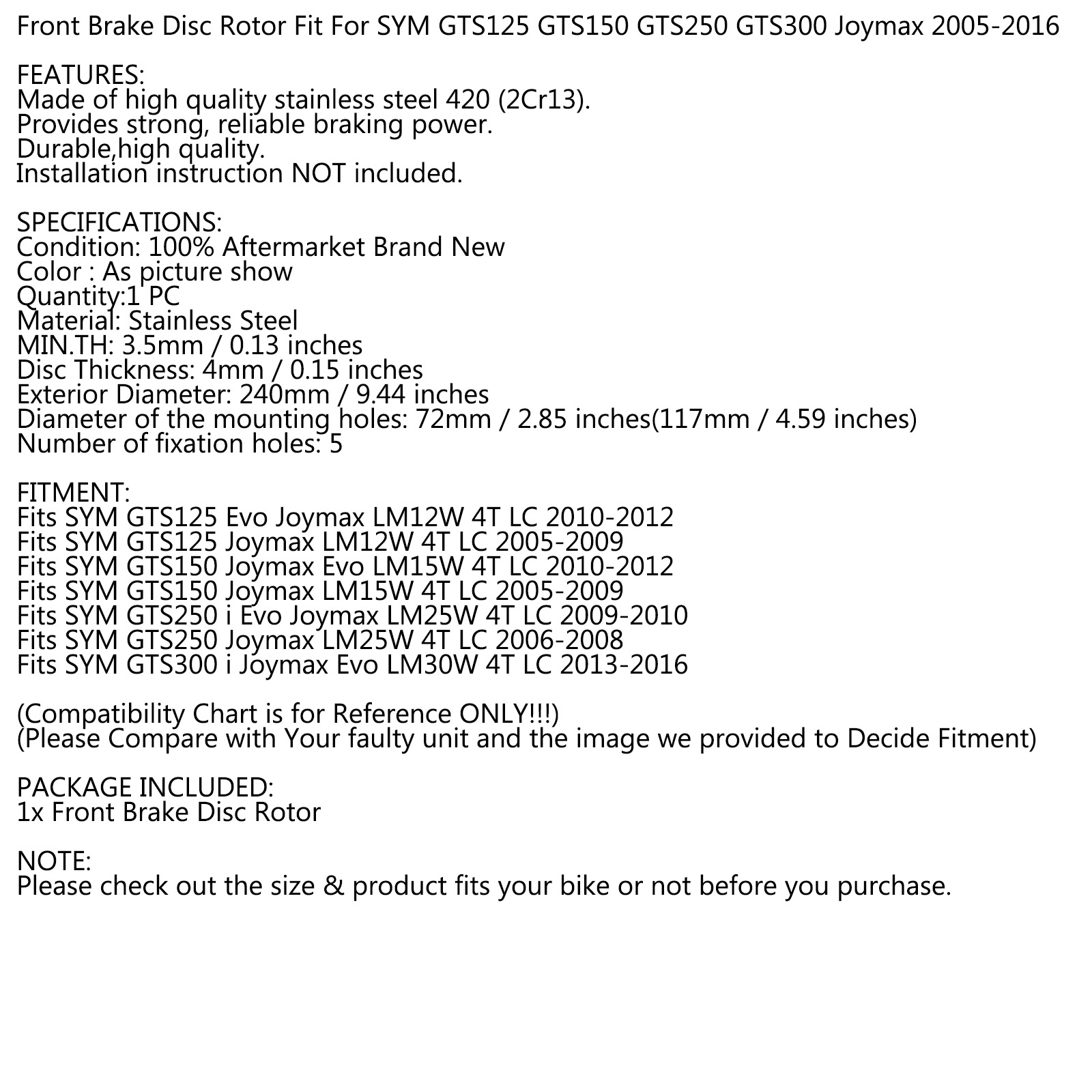 Front Brake Disc Rotor Fit For SYM GTS125 GTS150 GTS250 GTS300 Joymax 2005-2016