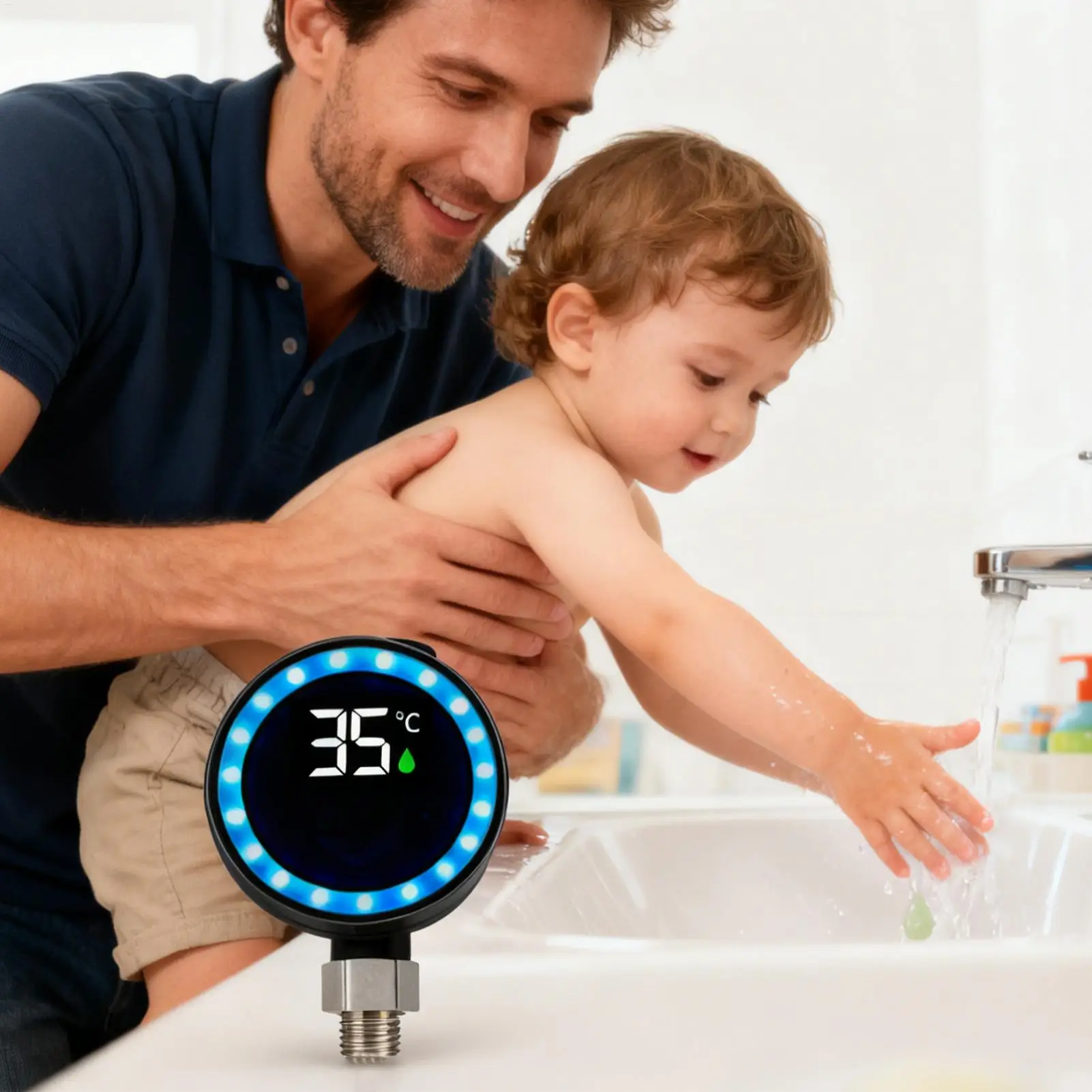 Bullet Points: 1.Child and Elder Friendly: This shower temperature gauge features a three-color LED display with smart temperature indication, creating a child and elder friendly environment while enhancing safety during showers by clearly communicating water warmth t 2.Smart Energy Utilization: By integrating water flow powered hydro power generation, the shower water temperature gauge achieves a maintenance free design, ensuring precise temperature tracking without external power sources 3.Precision Temperature Monitoring: The shower temperature meter utilizes a high precision sensor to deliver real-time monitoring of water temperature, ensuring accurate readings for burn prevention and enhanced safety during use 4.Effortless Setup: The bath water temperature meter eliminates the need for tools during setup, providing swift connections and wide-ranging compatibility. Users gain from its straightforward three-step installation method 5.Moisture-Resistant Gauge Build: Designed with a rust leak proof system and sealed protection, the bath water temperature gauge maintains accuracy without degradation; its waterproof design and sturdy housing make it suitable for humid spaces