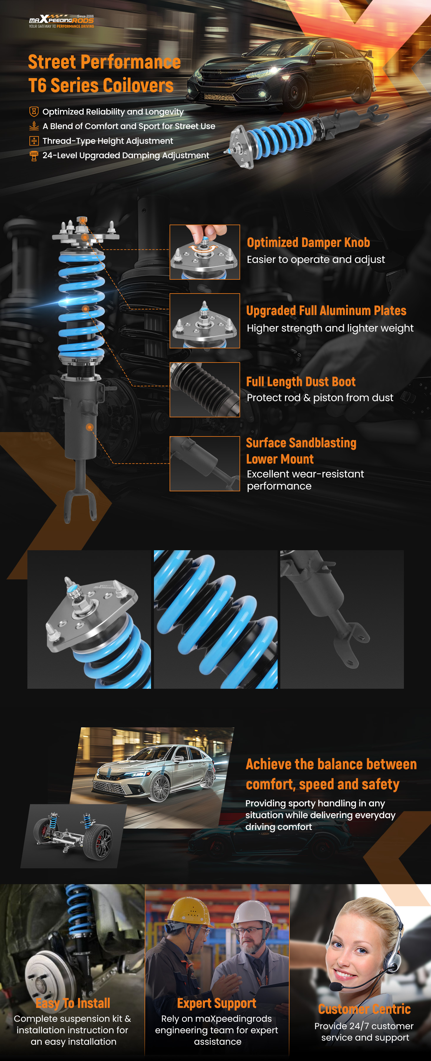 maXpeedingrods T6 Tieferlegungsschraube, serienmäßig mit einstellbarer Zugstufendämpfung, separater Höhenverstellung ohne Änderung der Vorspannung, entwickeltes Dämpfungsöl und verbesserte Rennfedern, einstellbare Camberplatte (für einige Fahrzeuge) und eine anständige Aussicht, bietet Ihnen mehr Möglichkeiten, Ihre Federung auf Leistung einzustellen und verleiht Ihrem Fahrzeug ein beeindruckenderes Aussehen. Außerdem werden alle unsere Spulen in einer staubfreien Fabrik montiert, was sich als gute Qualität und lange Lebensdauer herausstellt.