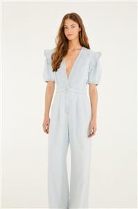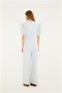 - FARM RIO Denim V Neck Pleated Ruffled Jumpsuit