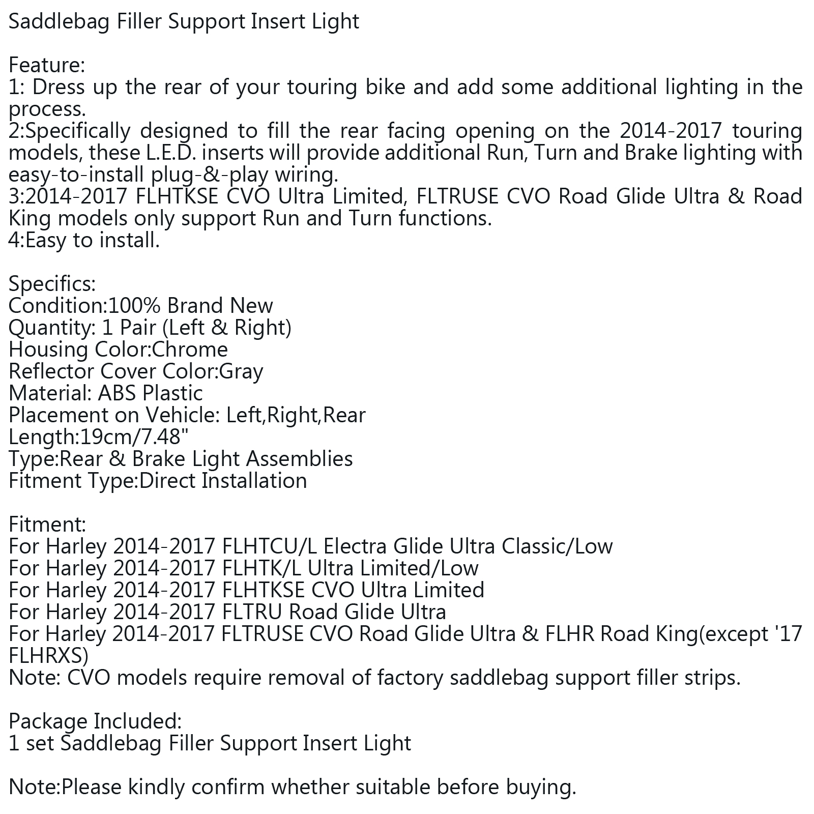 2:Specifically designed to fill the rear facing opening on the 2014-2017 touring models, these L.E.D. inserts will provide additional Run, Turn and Brake lighting with easy-to-install plug-&-play wiring.