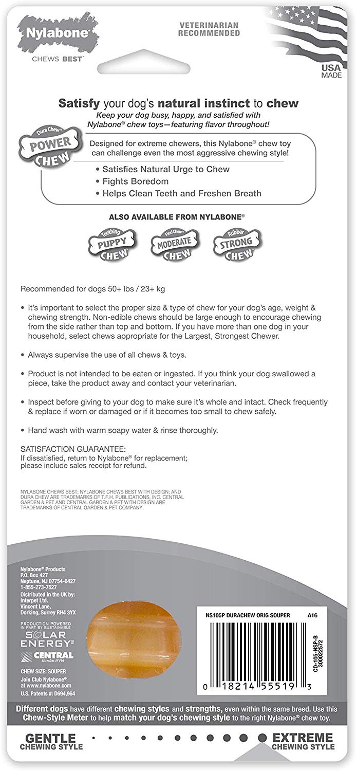 Strong dogs need strong chew toys! Made with tough, durable nylon, this Power Chew DuraChew Extra Large Dog Chew Toy is the long-lasting chew toy you need for your aggressive chewer. This power chew keeps dogs busy, satisfies their natural urge to chew, and encourages positive chewing habits. Plus, the bristles raised during chewing promote clean teeth and help control plaque and tartar buildup.