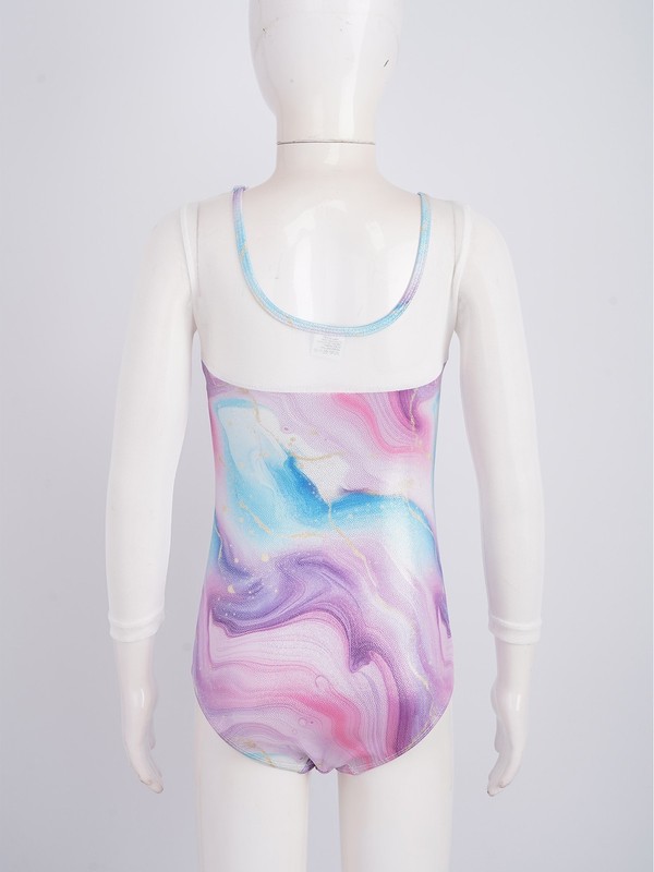The metallic print on the leotard catches the light, making the wearer stand out on stage or in the competition arena.