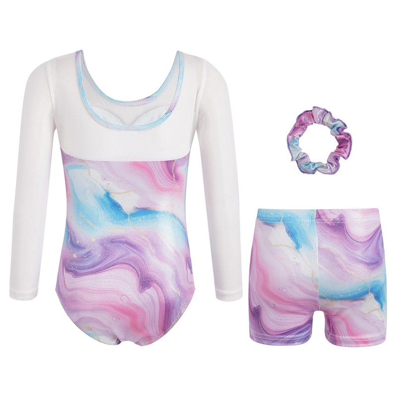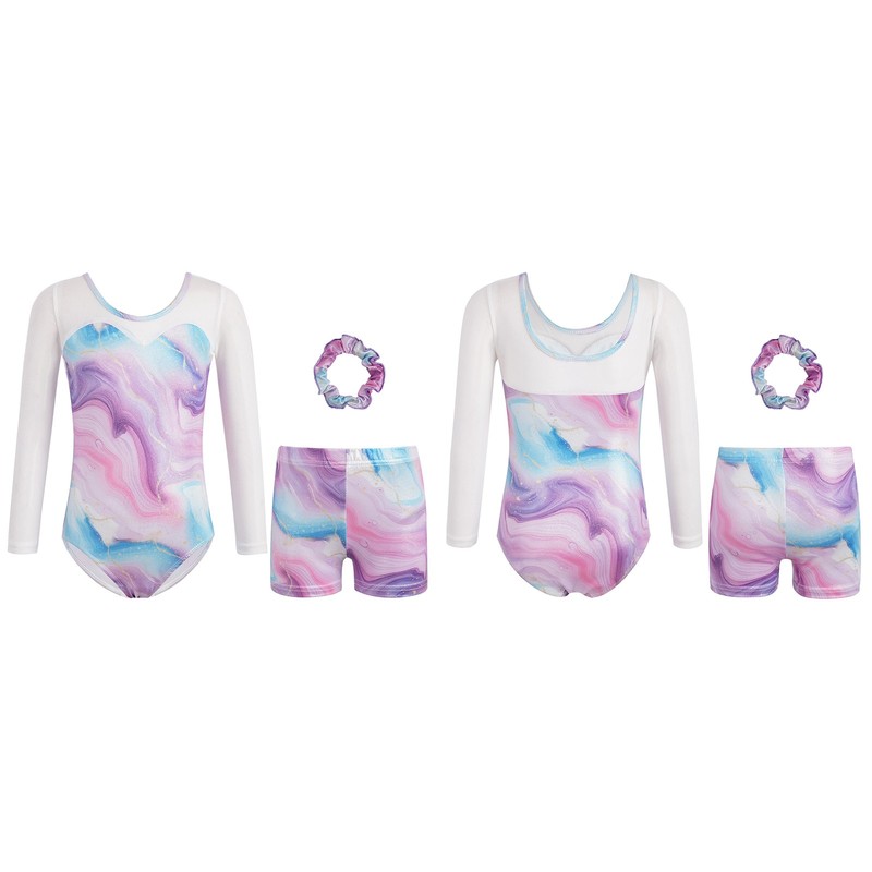 Girls Sparkly Leotard With Shorts Gymnastics Long Sleeve Bodysuit Exercise Set