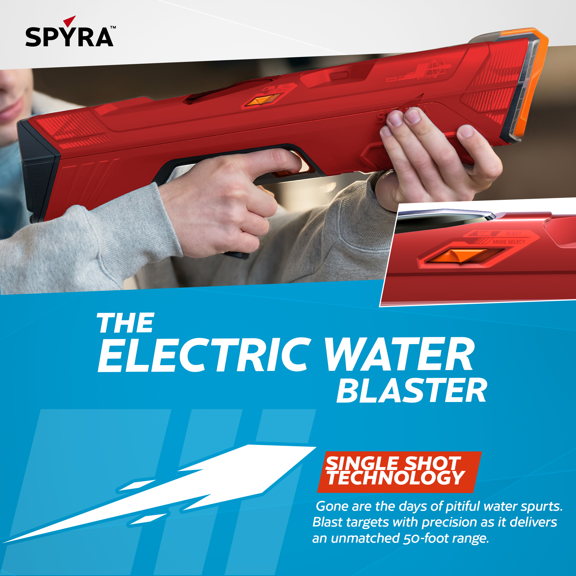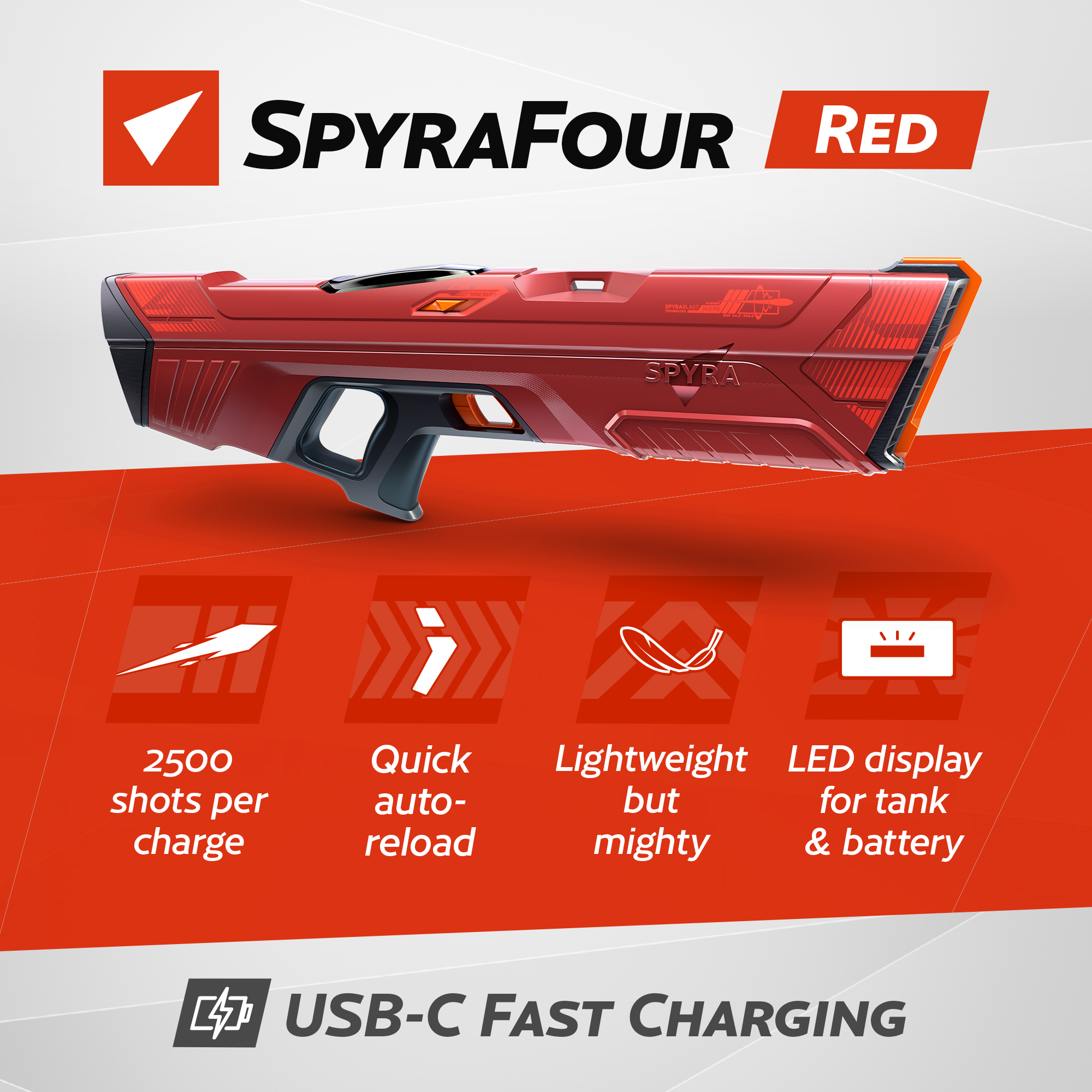 Prepare to dominate the summer water battle with the revolutionary SpyraFour Water Gun from SPYRA - the pinnacle of water blaster technology. This battery-powered marvel redefines the meaning of water gun with its unparalleled power and advanced features. Featuring 3 built in game modes, users can rotate between League Mode for tactical fun, Risk Mode where each trigger pull fires a powerful shot or nothing at all and React Mode where shot strength depends on the exact moment the trigger is pulled.