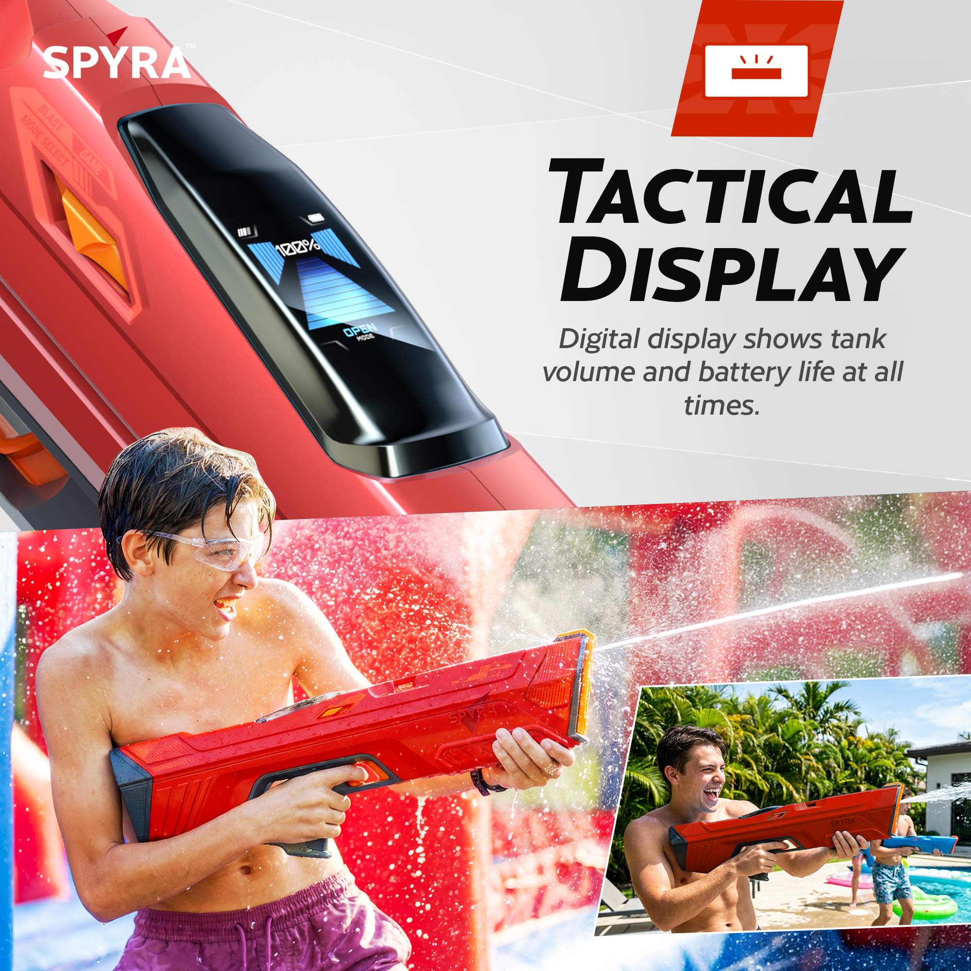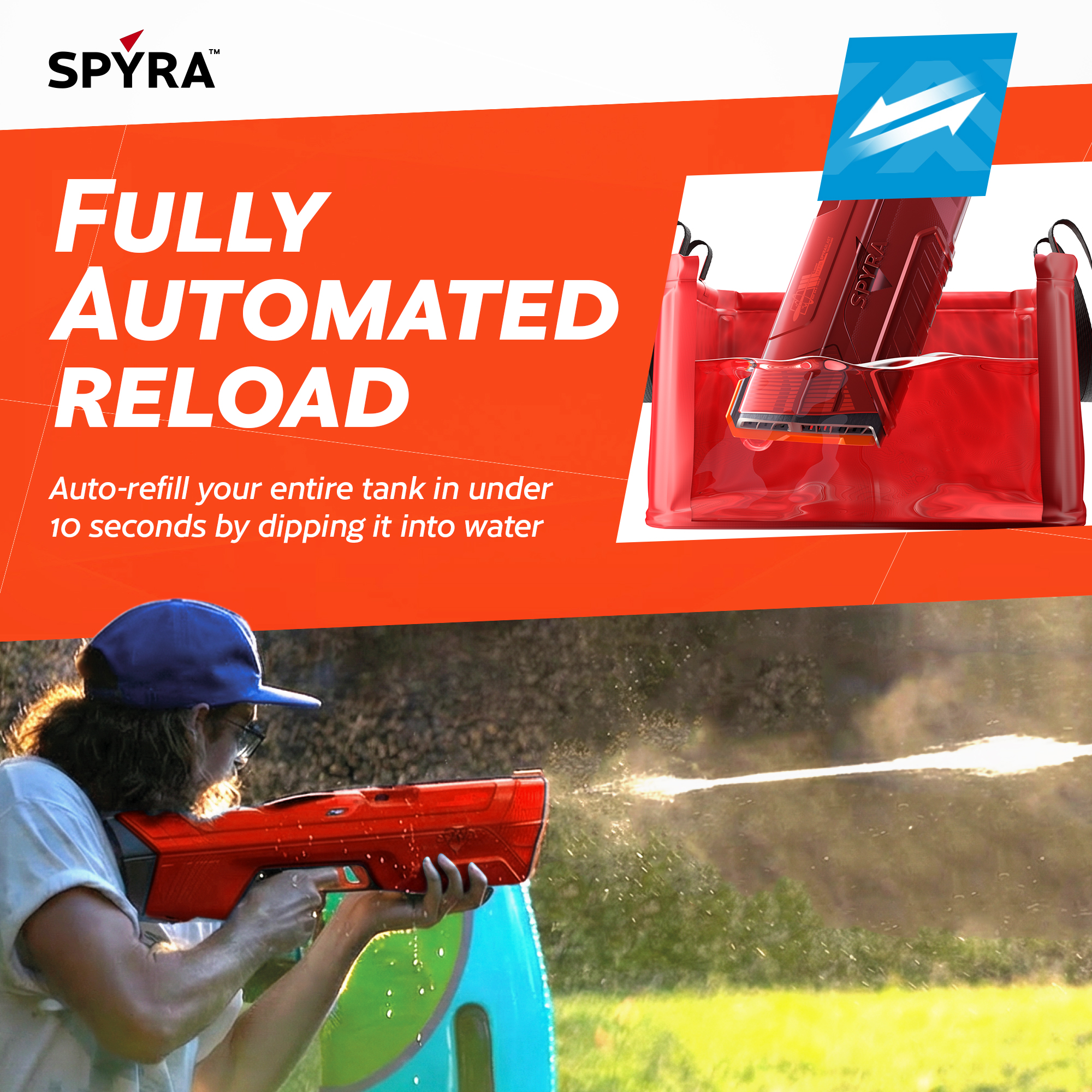 With a full tank, you can unleash 28 powerful SpyraBlasts, each reaching up to 50 feet. Out maneuver your opponents and claim victory with unmatched range and precision. Forget about tedious reloading this soaker features an automatic water absorption system. Simply submerge the muzzle in any water source, pull the trigger, and in just 12 seconds, you're fully loaded and ready to soak your friends and family. Stay on top of your game with the intuitive 2-inch LED Tactical Display, which provides real-time feedback on your tank volume and battery status.