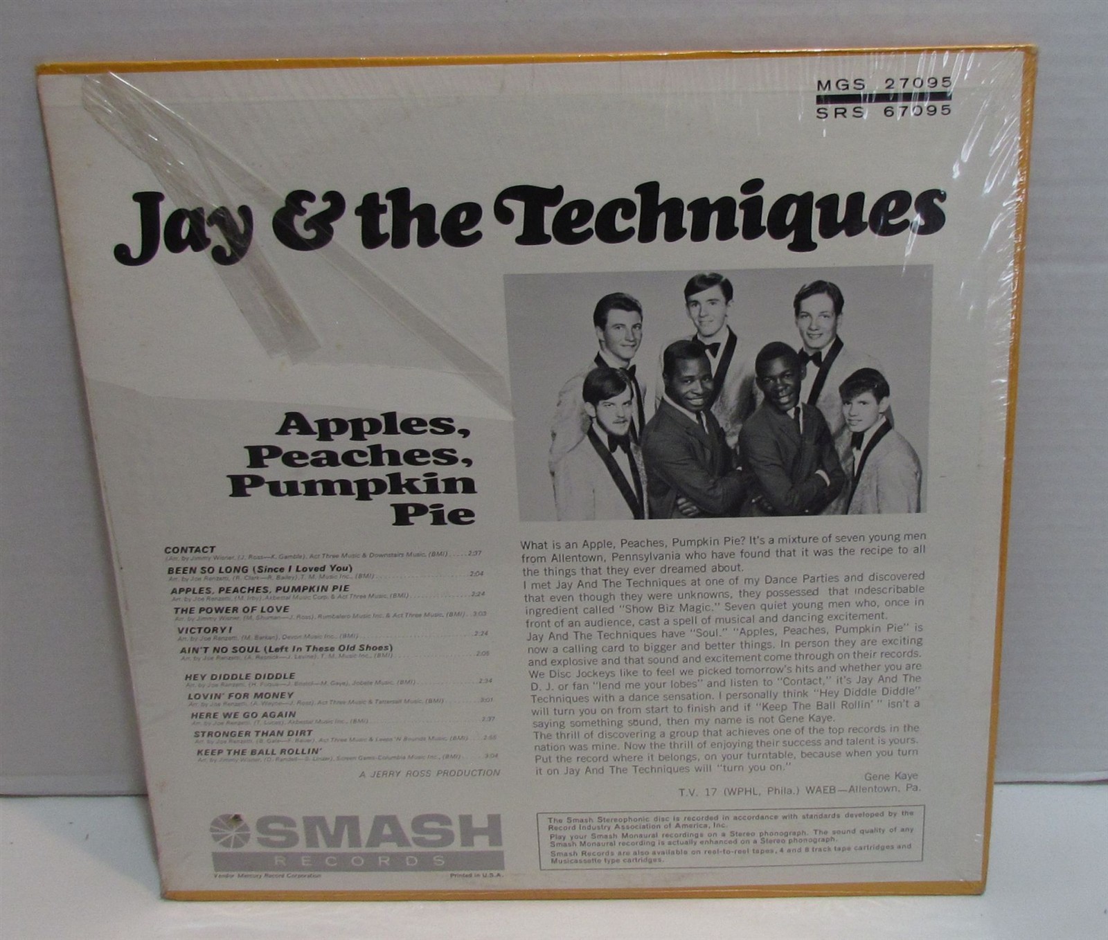 Jay and the Techniques-Apples, Peaches, Pumpkin Pie LP (Smash SRS 67095) Still sealed. Small drill hole through cover, 3 inch split along the shrink wrap on the edge.