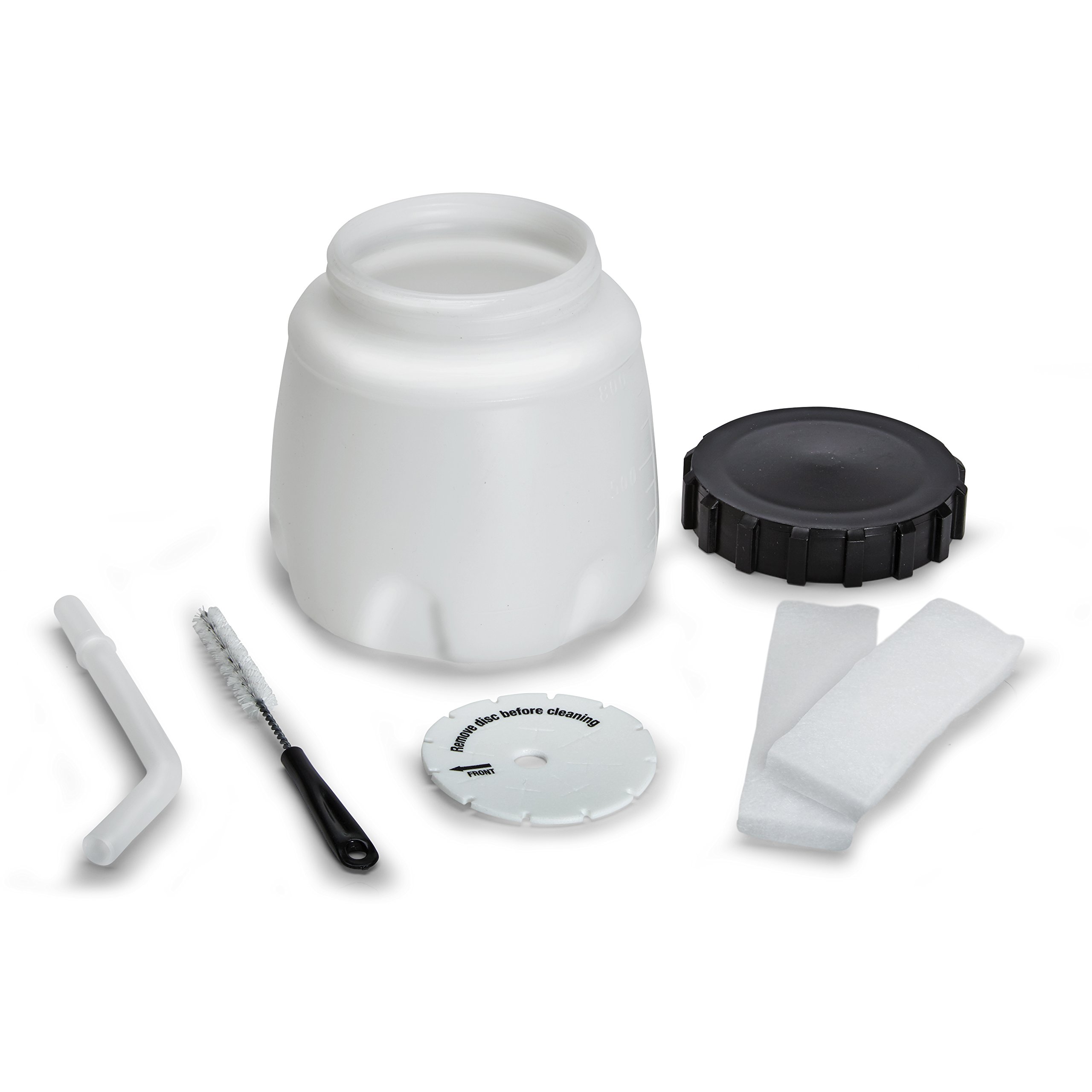 - 7 ACCESSORIES INCLUDED: Comes with a 27 ounce replacement container, container lid, two air filters, foam splash guard, suction tube and cleaning brush.
