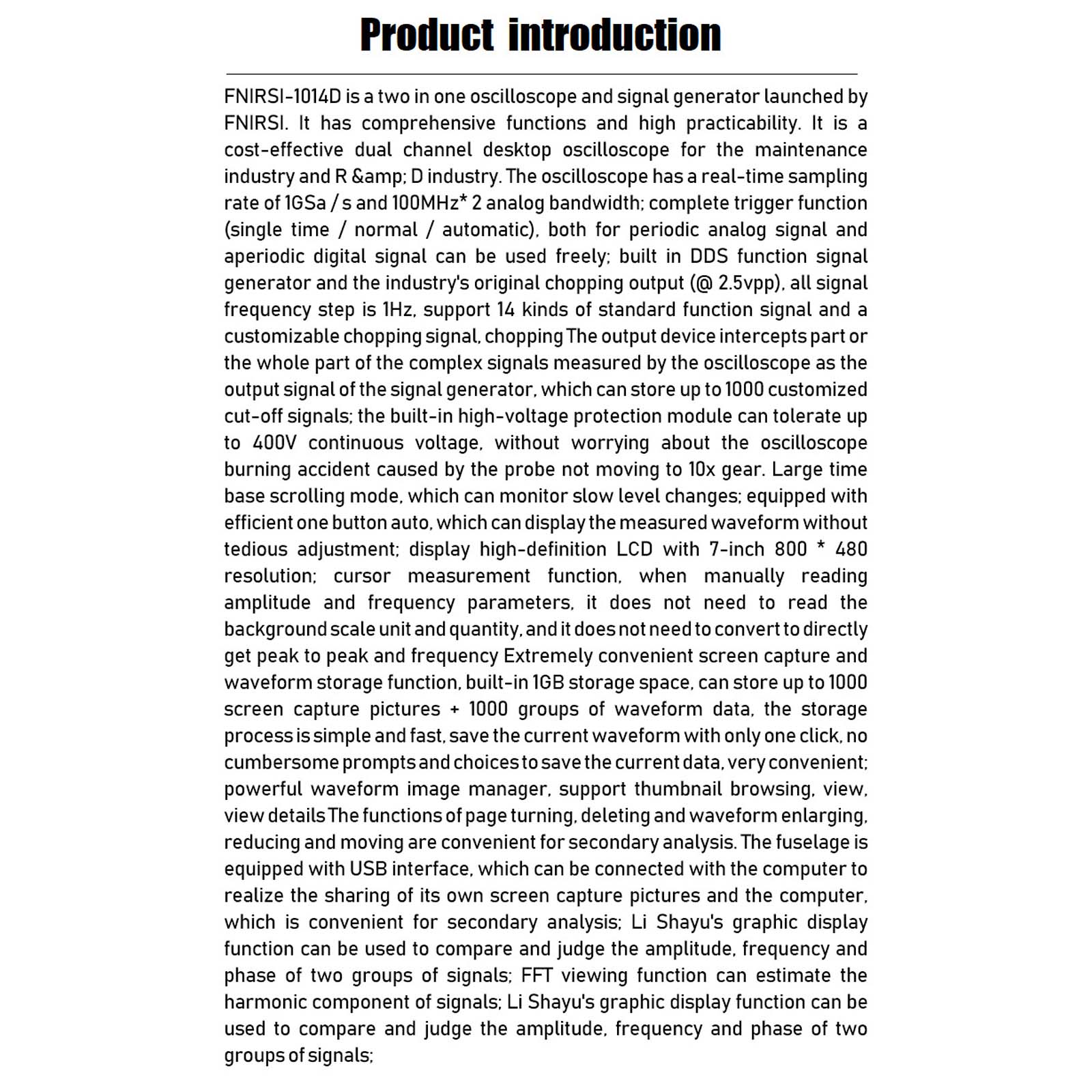 FNIRSI-1014D is a two in one oscilloscope and signal generator launched by FNIRSI. It has comprehensive functions and high practicability. It is a cost-effective dual channel desktop oscilloscope for the maintenance industry and R & D industry. The oscilloscope has a real-time sampling rate of 1GSa / s and 100MHz* 2 analog bandwidth; complete trigger function (single time / normal / automatic), both for periodic analog signal and aperiodic digital signal can be used freely; built in DDS function signal generator and the industry's original chopping output (@ 2.5vpp), all signal frequency step is 1Hz, support 14 kinds of standard function signal and a customizable chopping signal, chopping The output device intercepts part or the whole part of the complex signals measured by the oscilloscope as the output signal of the signal generator, which can store up to 1000 customized cut-off signals; the built-in high-voltage protection module can tolerate up to 400V continuous voltage, without worrying about the oscilloscope burning accident caused by the probe not moving to 10x gear. Large time base scrolling mode, which can monitor slow level changes; equipped with efficient one button auto, which can display the measured waveform without tedious adjustment; display high-definition LCD with 7-inch 800 * 480 resolution; cursor measurement function, when manually reading amplitude and frequency parameters, it does not need to read the background scale unit and quantity, and it does not need to convert to directly get peak to peak and frequency Extremely convenient screen capture and waveform storage function, built-in 1GB storage space, can store up to 1000 screen capture pictures + 1000 groups of waveform data, the storage process is simple and fast, save the current waveform with only one click, no cumbersome prompts and choices to save the current data, very convenient; powerful waveform image manager, support thumbnail browsing, view, view details The functions of page turning, deleting and waveform enlarging, reducing and moving are convenient for secondary analysis. The fuselage is equipped with USB interface, which can be connected with the computer to realize the sharing of its own screen capture pictures and the computer, which is convenient for secondary analysis; Li Shayu's graphic display function can be used to compare and judge the amplitude, frequency and phase of two groups of signals; FFT viewing function can estimate the harmonic component of signals; Li Shayu's graphic display function can be used to compare and judge the amplitude, frequency and phase of two groups of signals;
