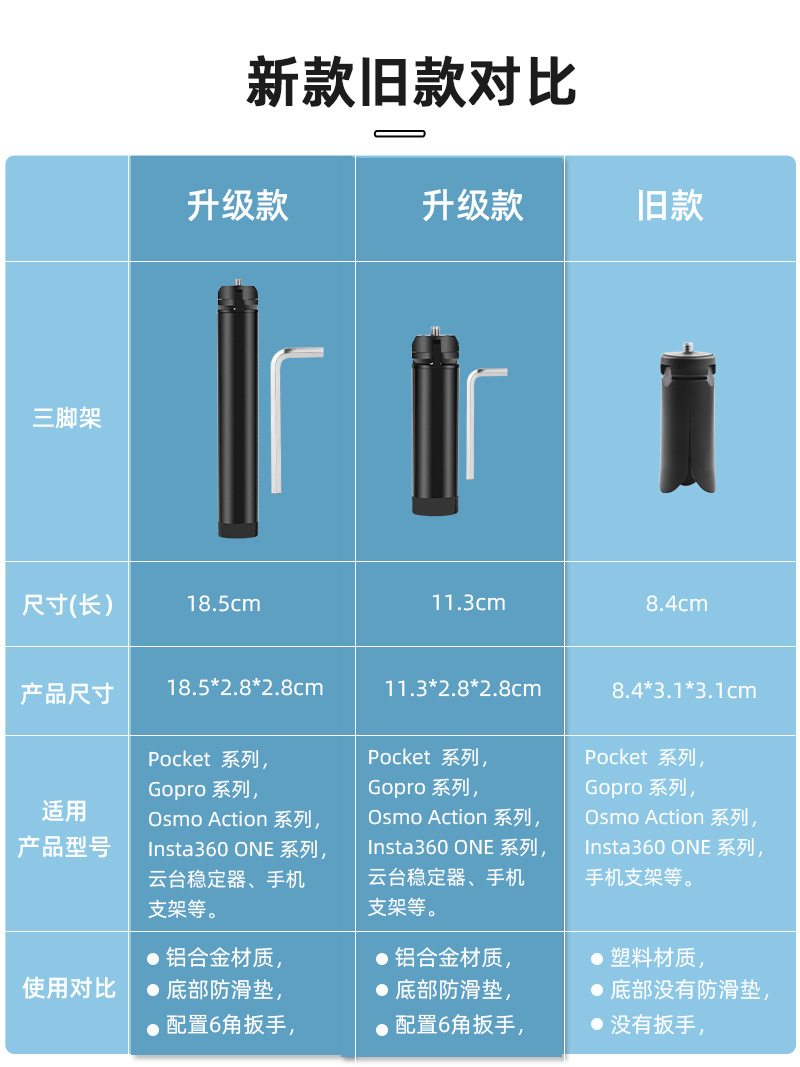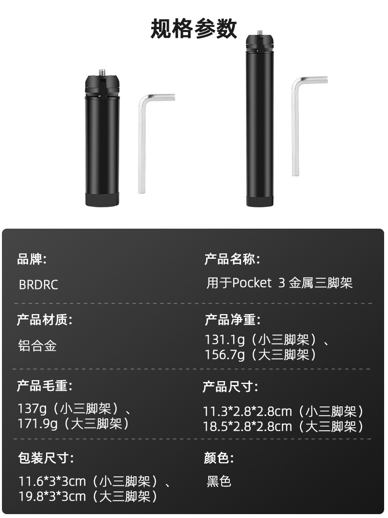 Product size: 11.3 * 2.8 * 2.8cm (small tripod) 18.5 * 2.8 * 2.8cm (large tripod)
