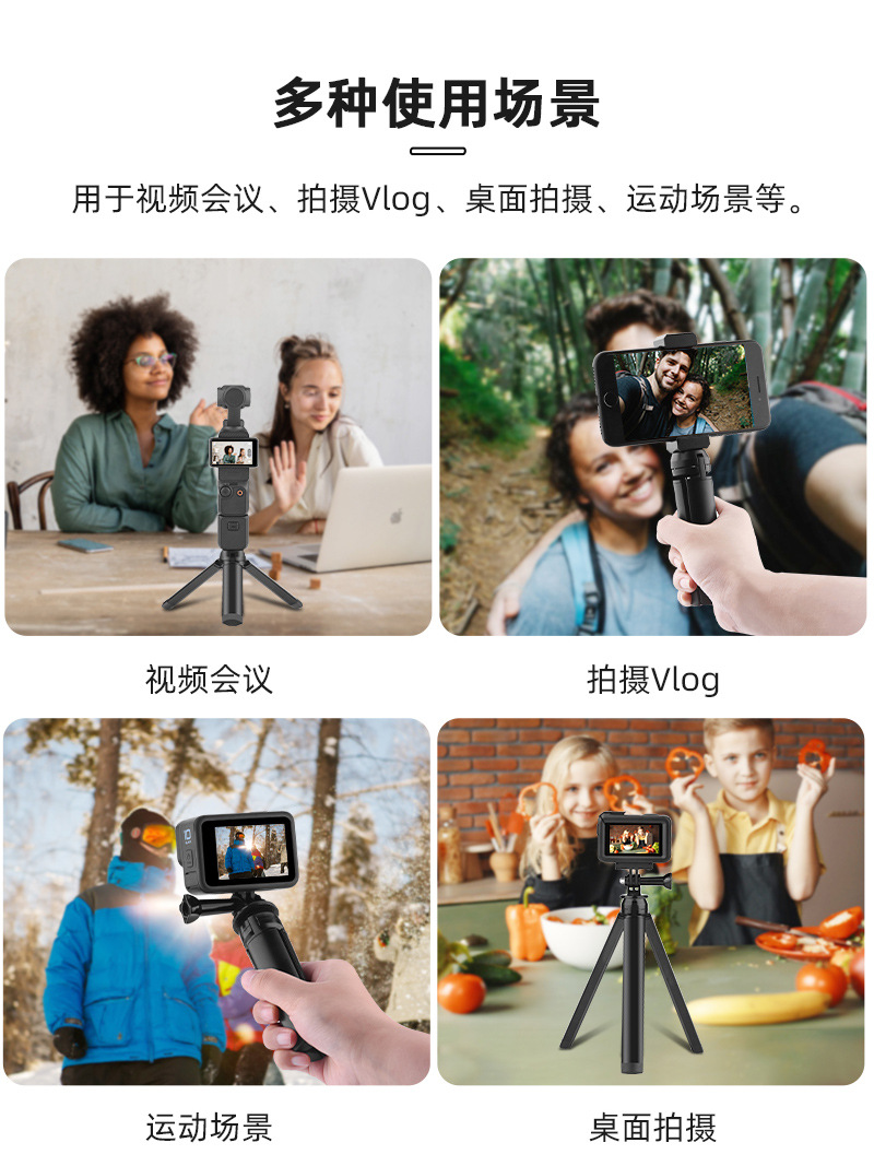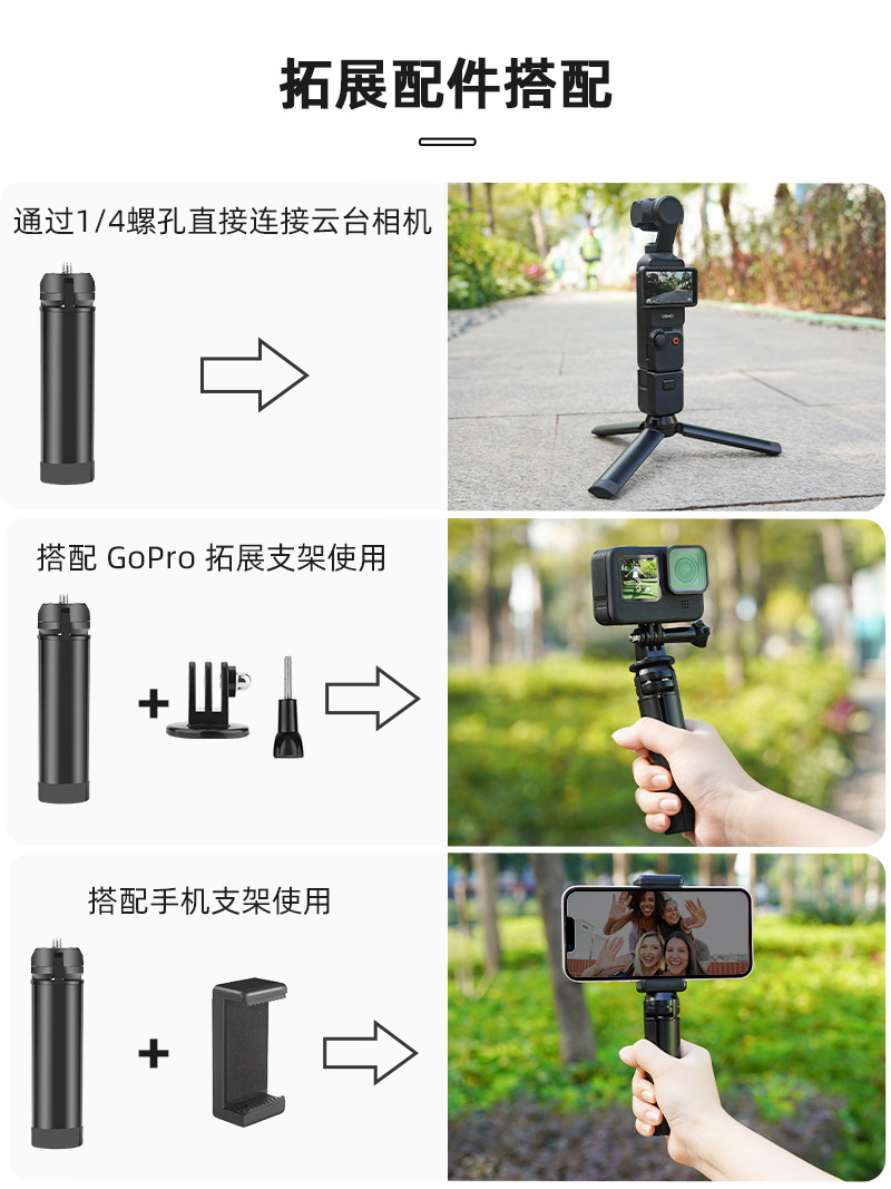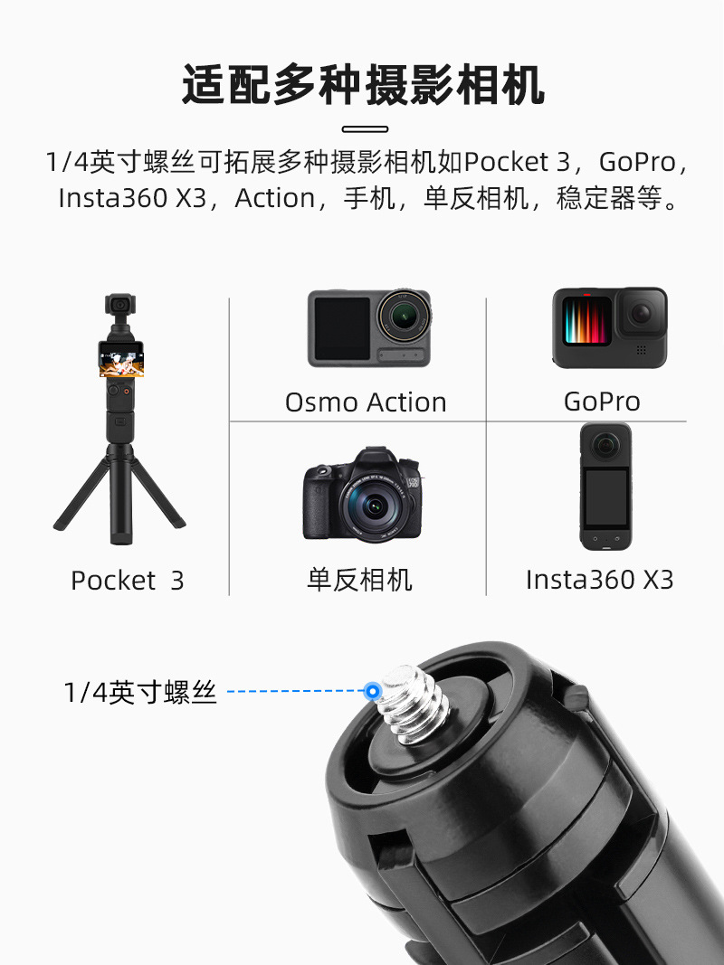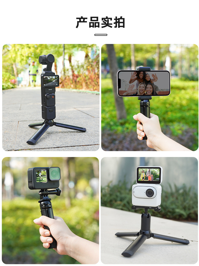 4. The top has a 1/4 nut port and screws, and can be connected to various sports cameras, stabilizers, and other photography accessories;