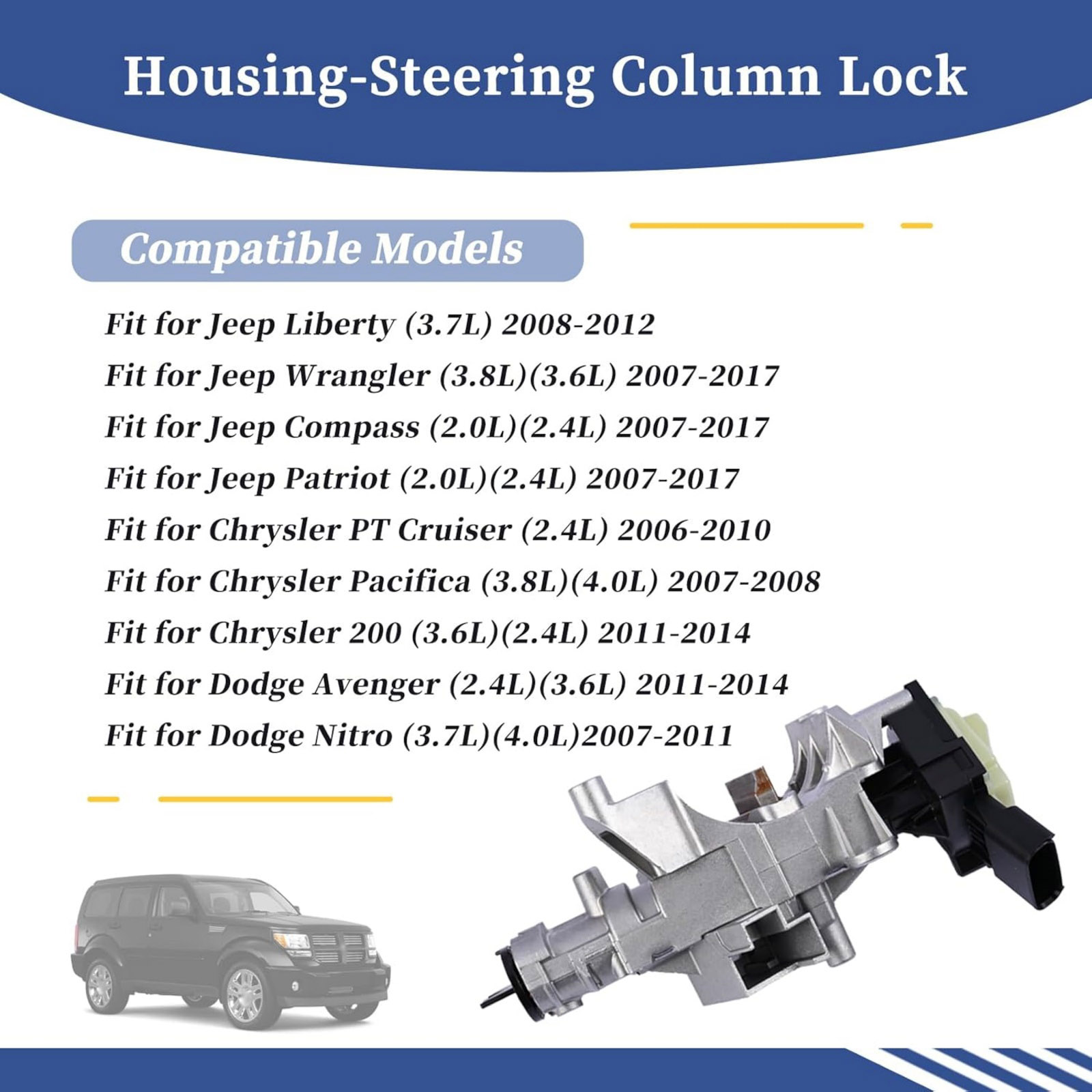 Features: 1. Please Verify This Is The Right Part Number Before Ordering 2. Use Quality Materials, 100% Tested Before Shipping 3. Easy Install And Convenient To Use 4. Great Quality, Direct Replacement Specifications: Type: Ignition Switch Cylinder Housing Condition: 100% New Material: Metal+Plastic OEM: 68054822AB, 5057297AF, 5057297AH, 5057297AJ, 5057297AI, 5057297AG, 68054822AA, 05057297AJ Fitment: For Jeep Liberty (3.7L) 2008-2012 For Jeep Wrangler (3.8L) (3.6L) 2007-2017 For Jeep Compass (2.0L) (2.4L) 2007-2017 For Jeep Patriot (2.0L) (2.4L) 2007-2017 For Chrysler PT Cruiser (2.4L) 2006-2010 For Chrysler Pacifica (3.8L) (4.0L) 2007-2008 For Chrysler 200 (3.6L) (2.4L) 2011-2014 For Dodge Avenger (2.4L) (3.6L) 2011-2014 For Dodge Nitro (3.L) (4.0L) 2007-2011 Packaging Includes: 1* Ignition Switch Cylinder Housing