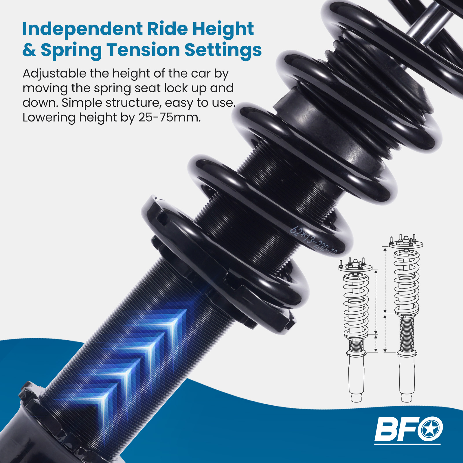- Height adjustable: Yes, lowering 25-75mm depending on the vehicle models